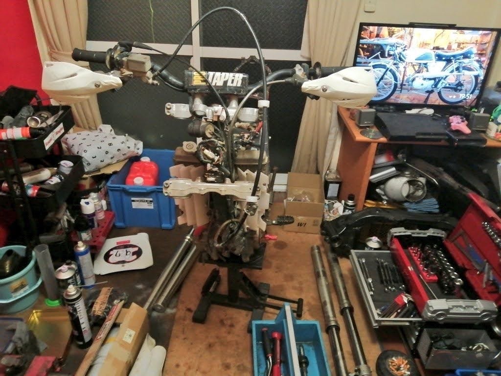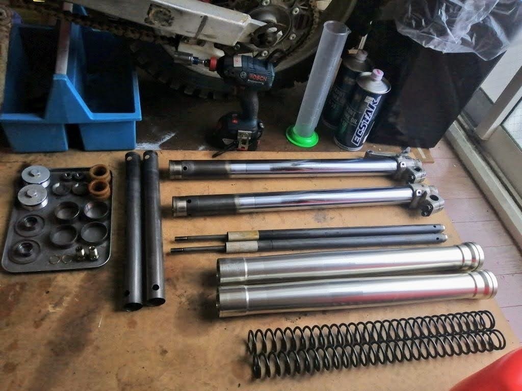 ・SST、インパクトレンチが無いと苦労する倒立フォークのO/H作業。また、フォーク内の部品のオリフィスを溶接で塞ぎ穴を開け直しての減衰特性の根本的な変更・油面変更やオイル粘度の変更による細やかなセッティングも可能です。またフォークの形式に依りますが内部の部品を溶接加工し車高を下げる事なども可能です。もちろん正立フォークもお任せ下さい
