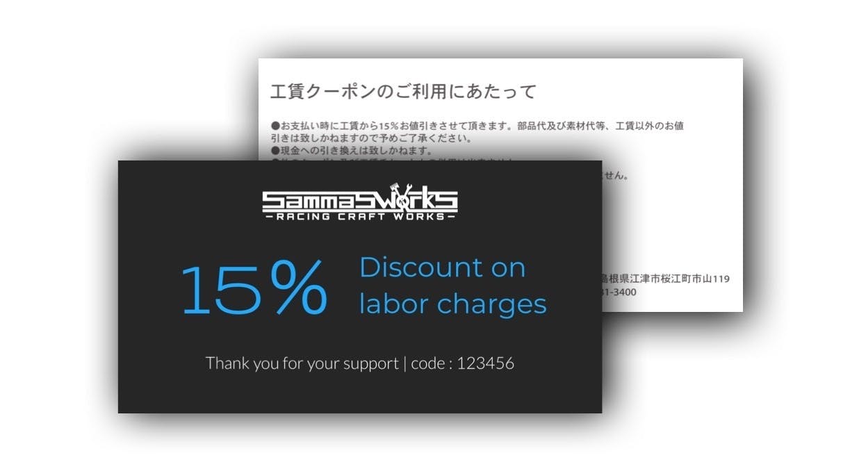 更に3,500円/7,000円のお気持ちプランに関しましては発行日より2年間お使い頂ける工賃15%割引クーポンをお付け致します。何か作業依頼がございましたら、どうぞお気軽にお問い合わせください。