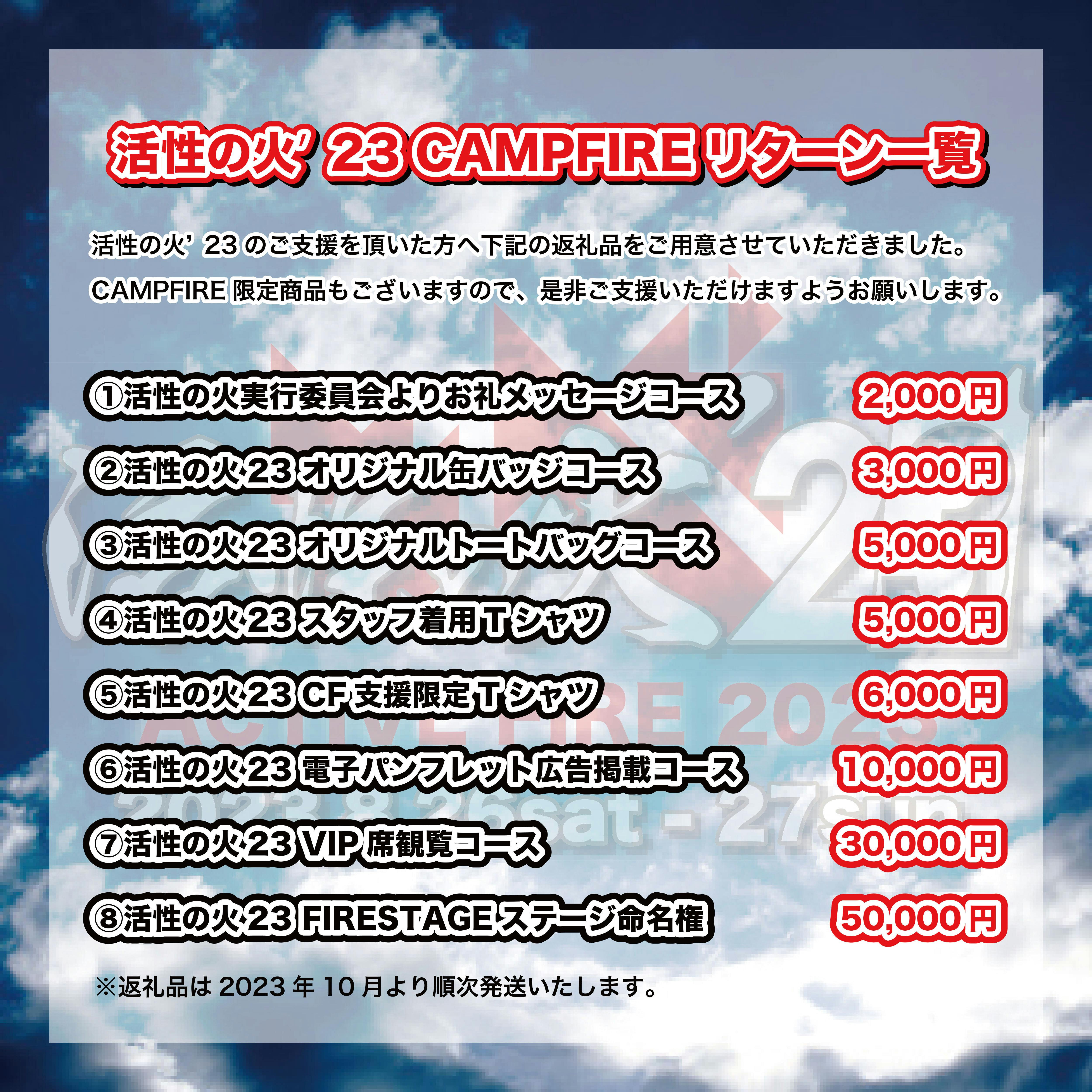 活性の火'23開催のご支援をいただいた方へ下記の通りリターンをご用意させていただきました。