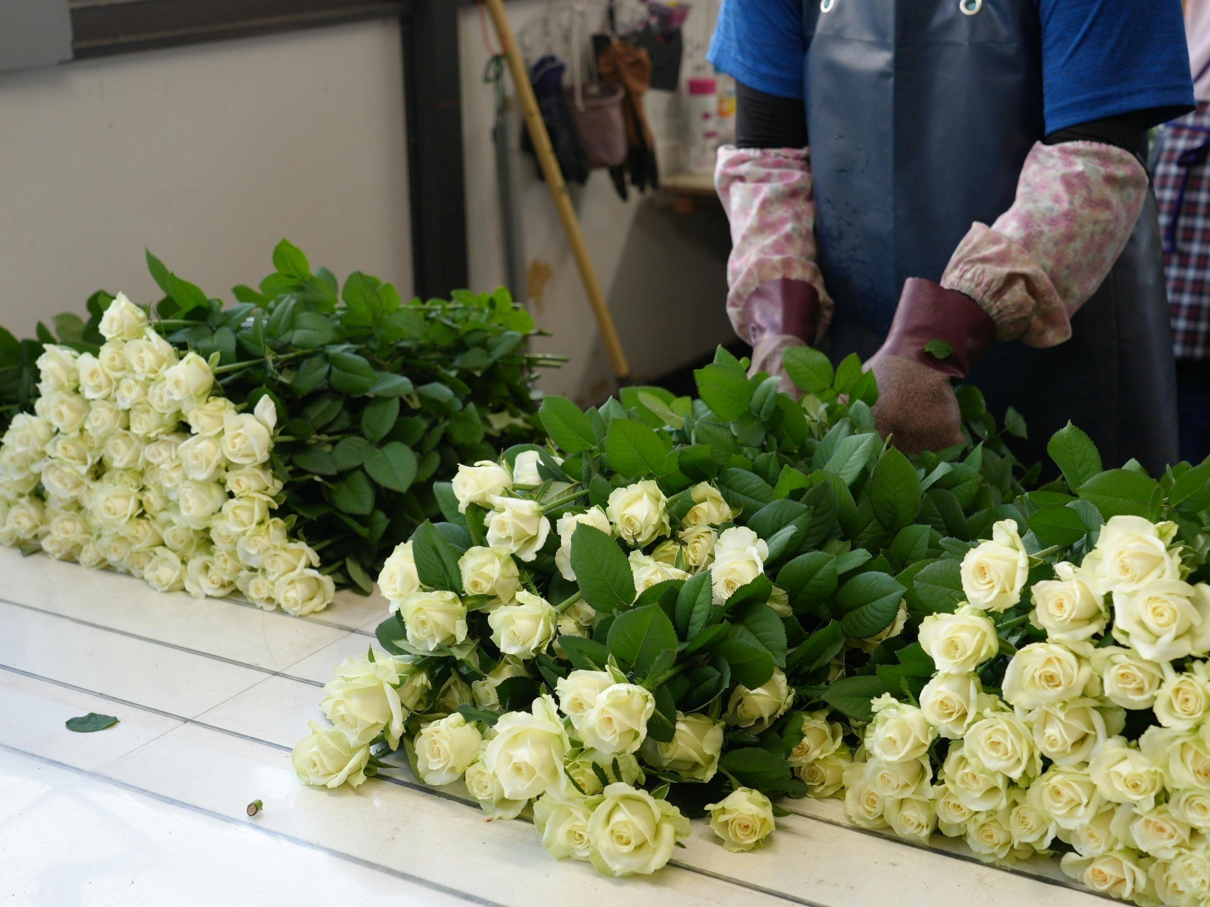 特に、花を切るタイミングの見極めは素晴らしいです。お客様の手元に最高の状態で届けることができるよう、つぼみの状態を見極めて彩花しています。従業員の方々の品質のチェックも厳しく、調整作業も的確なため、安彦園芸から出荷されるバラは、均一で美しく咲き揃っています。このように出荷するのは大変な手間で、なかなか真似できないところです。