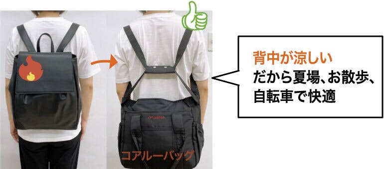 気温はすでに真夏!年々暑くなってきました。昨年の夏に背中に汗が溜まりにくい構造のコアルーバッグとしてご紹介したところ大変好評頂き、ありがとうございました。今年も背中を快適に!コアルーのリュックスタイルで役立てたいと思います。