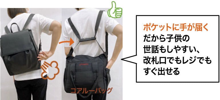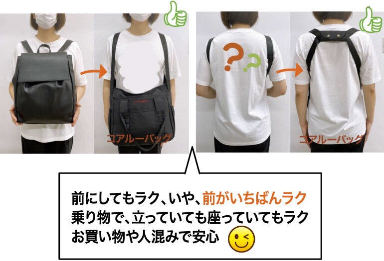 コアルーの良い所はなんと言っても「ぱぱっと変身」するところ! 二重になっているベルトの間に腕を入れるだけなので、ベルトを出したりしまったりする必要も、こことここに通してなどの手順も要りません。カバンが後ろになればリュックに、前になれば前抱えにという、ショルダーバッグの普段使いとあまり変わらない扱い方です。