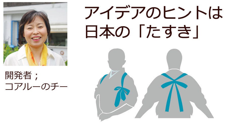 紐一本で子供を負んぶすることができるんだ! 韓国出身の私の目に映った「おんぶ紐」の使い方は目からうろこ!大変衝撃でした。たすき掛けのクロス構造を左右に分けただけのとてもシンプルな構造で、日常のカバンに応用し様々な用途で開発をしていきます。
