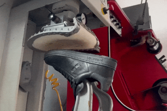 靴製造プレス機によるソール接着では靴と足型に沿って均等に圧をかけるため、隙間なく綺麗に接着することが可能。