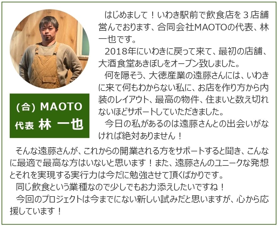 「企業ひと技応援ファンド」事業は、いわき市・いわき産学官ネットワーク協会・いわき信用組合・いわき商工会議所が連携し、次世代に継承すべき技術・サービス・商品を持つ事業者、ポストコロナに対応するため新しいビジネスモデル構築に取り組む事業者をサポートするために企画されたものです。今回、私たちを、新しい時代に「残したい・伝えたい」企業として選んでいただきましたので、是非とも皆様のお力をお貸しください。ぜひとも応援をよろしくお願いいたします。(事務局・いわき商工会議所)