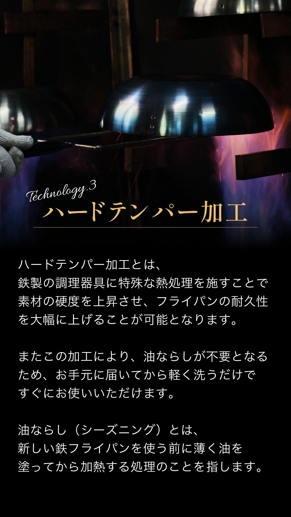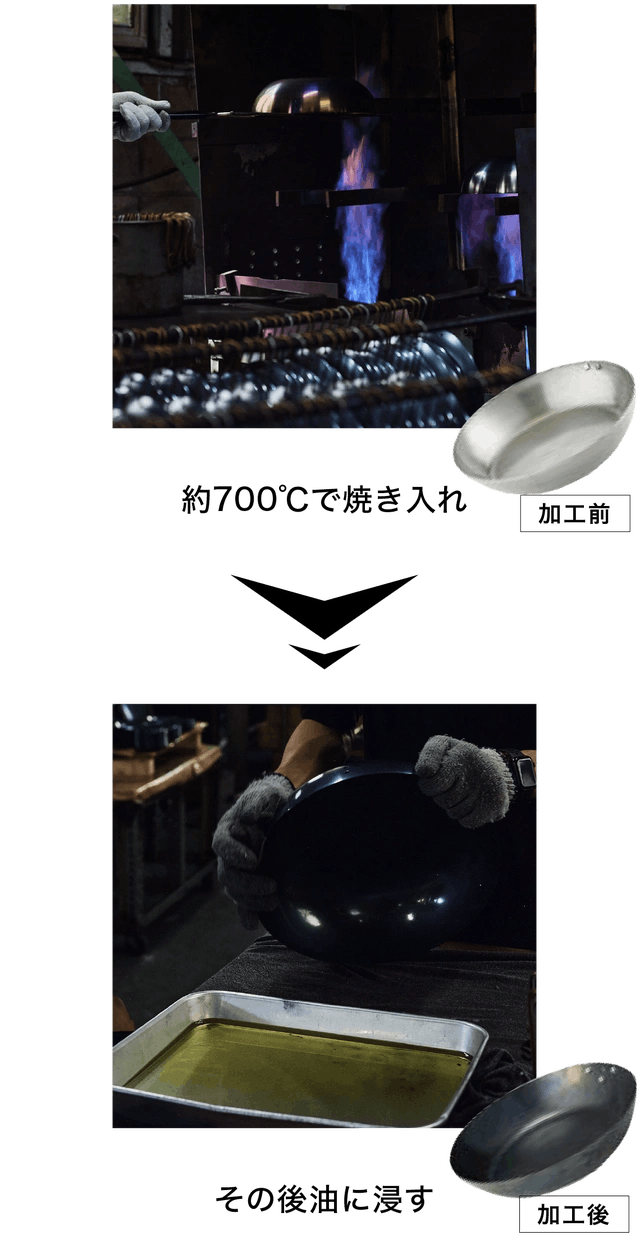 しかし、至高の鉄フライパン哲(TETSU)は、ハードテンパー加工を施しています。工場でシーズニングを最大700度の火力で行ってから出荷するので、お手元に届いた瞬間からすぐに美味しい料理を作れます。