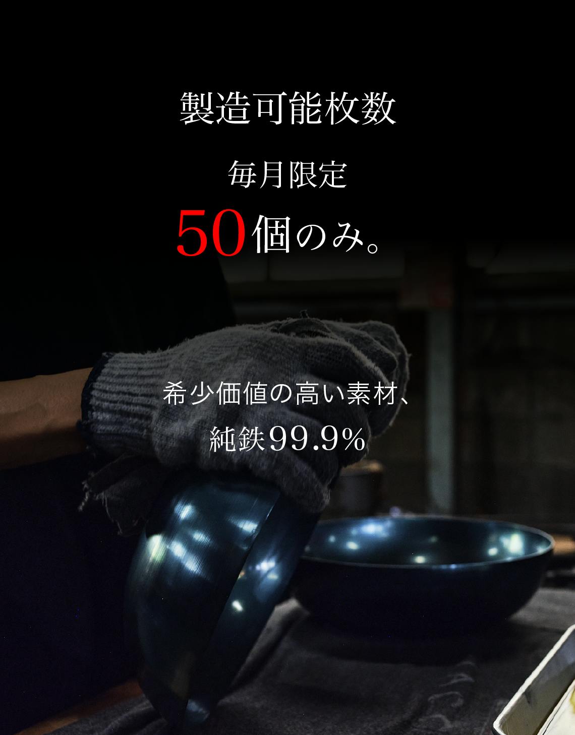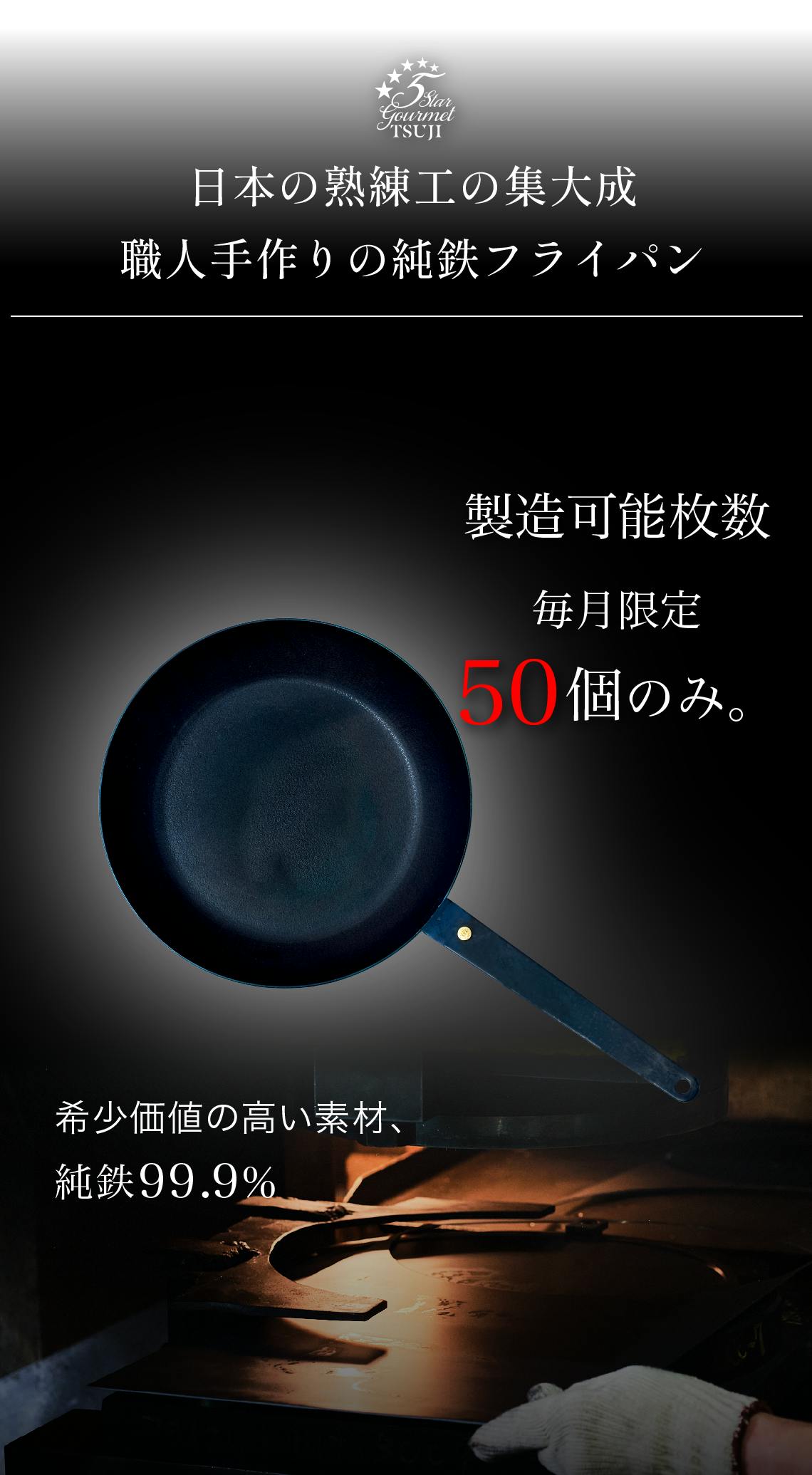これらの加工ができる技術者にも数が限られており、その手間ひまをかけた製造方法と素材の希少性から、純鉄フライパンの生産数は、月に50本と限られています。