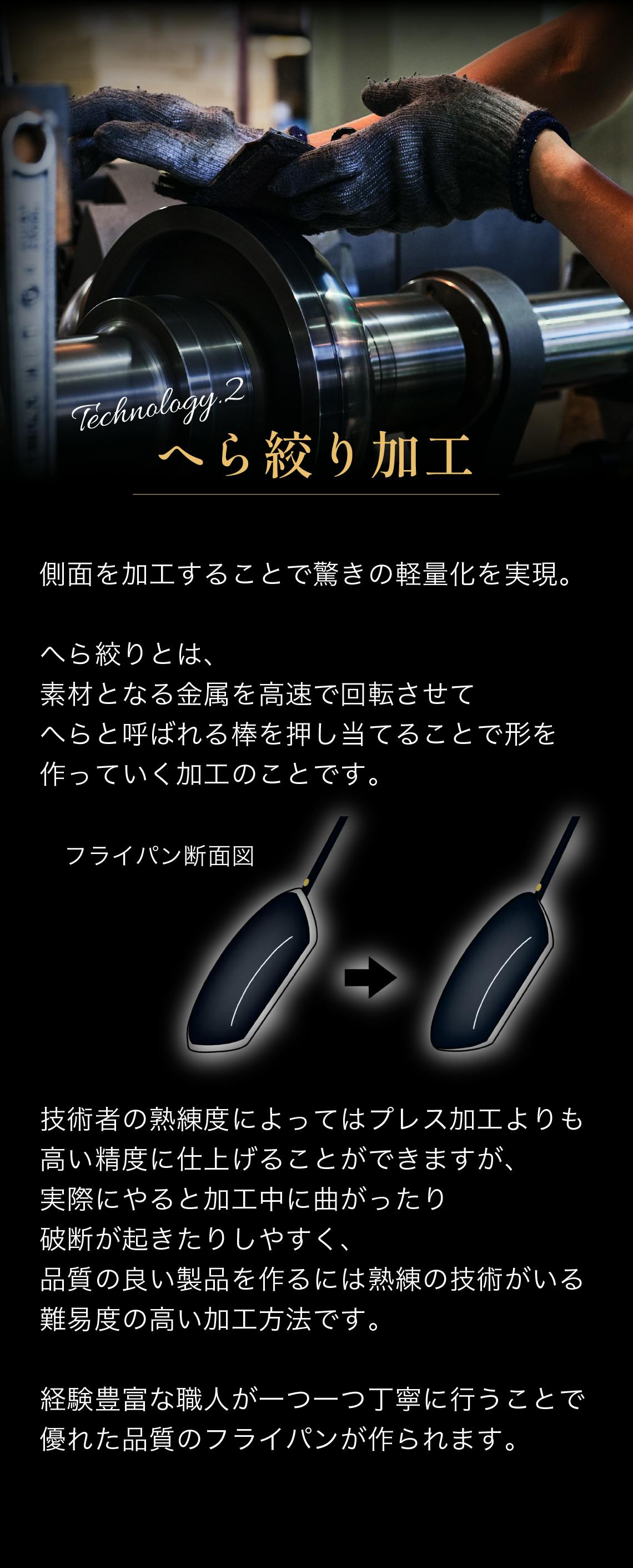 その結果、至高の鉄フライパン哲(TETSU)は、驚くほどの軽量化を達成しています。この軽さは、料理中の操作性を高め、使いやすさを向上させます。このように、へら絞り加工は、フライパンの性能と使用感を大きく左右する重要な工程なのです。