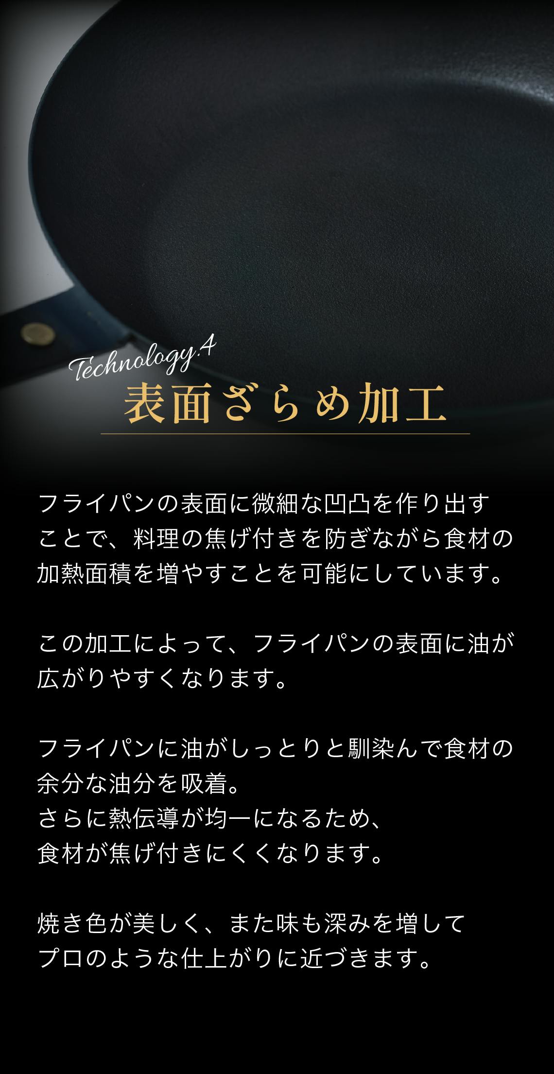この穴に油が入り込むことで、フライパン表面に薄い油の膜が作られます。