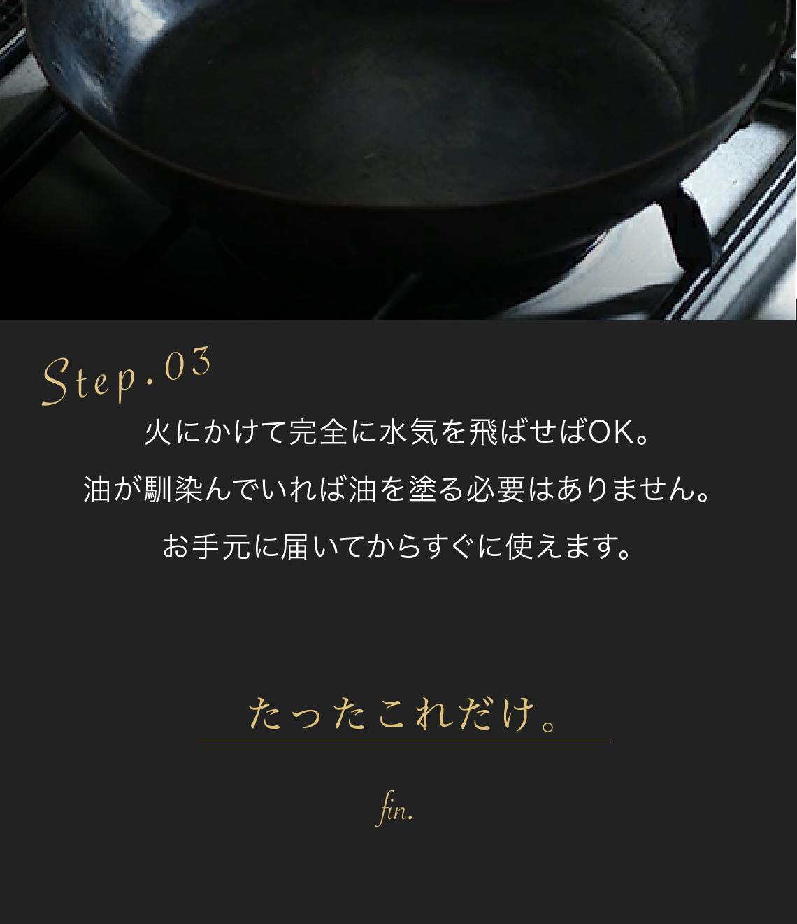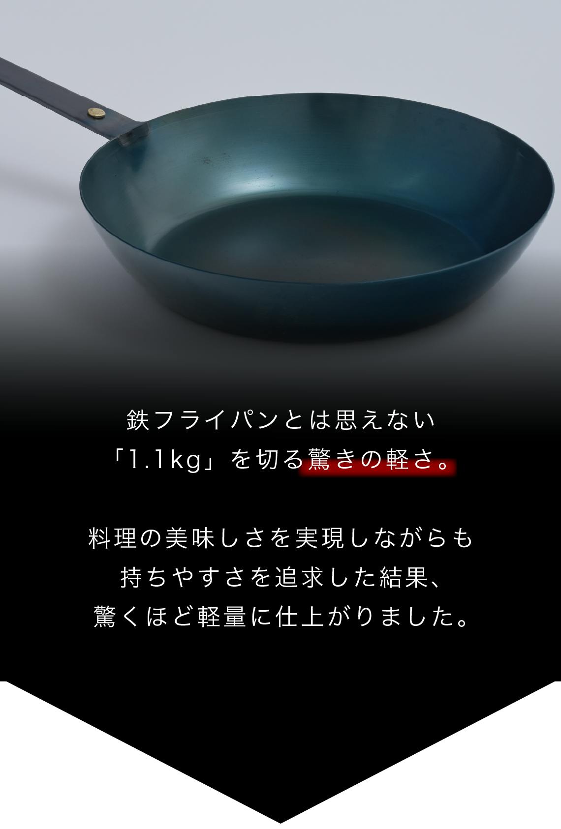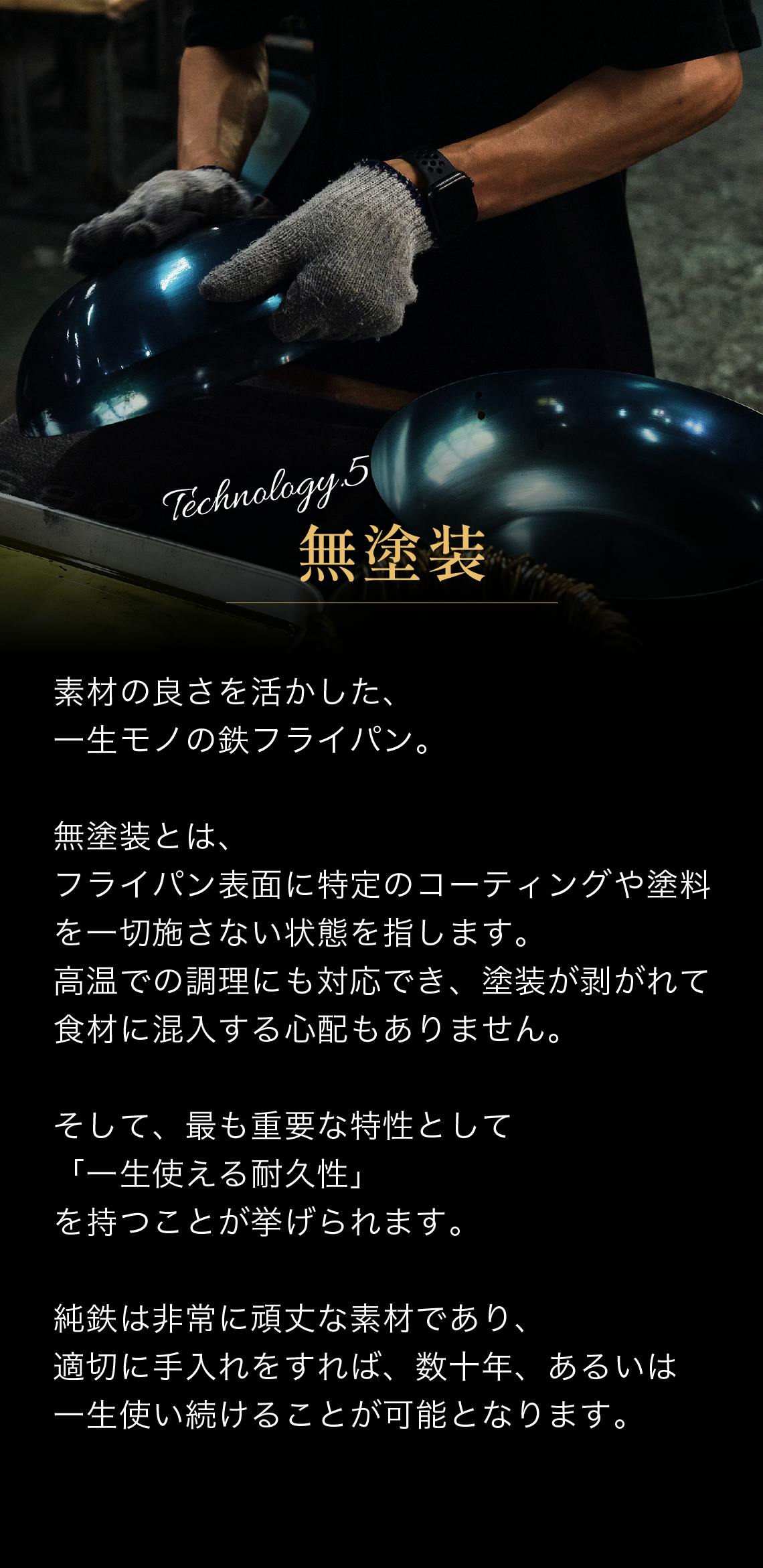 つまり、フライパンの表面はそのままの鉄の状態で、その素材の良さ、つまり鉄の強度と耐久性をそのまま活かしています。このため、至高の鉄フライパン哲(TETSU)は一生モノと言える長持ちするフライパンになります。