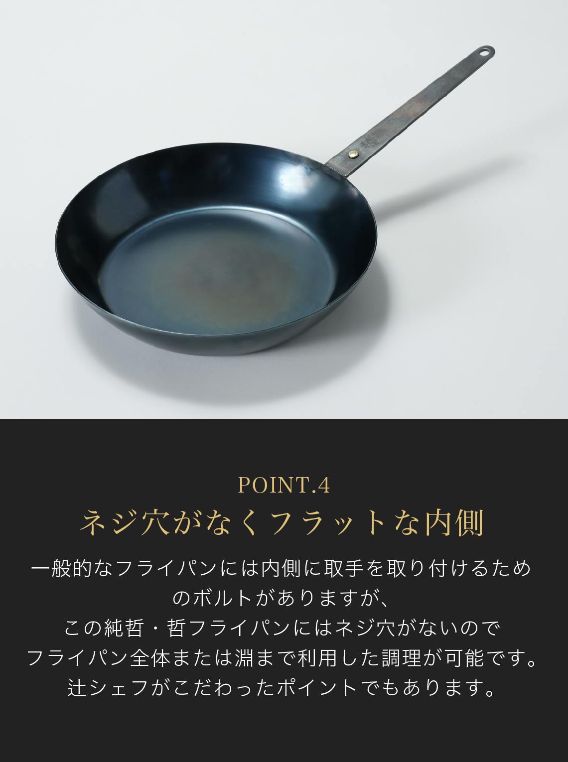 これらの商品は、ただ単に料理をする道具ではなく、その使用を通じて食事そのものの美味しさを引き立て、そして健康と幸せを実現する道具です。これこそが私、辻哲弥が追求するフライパンのあり方、そして製品に込めた深い想いです。