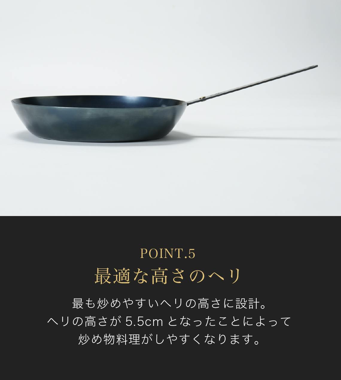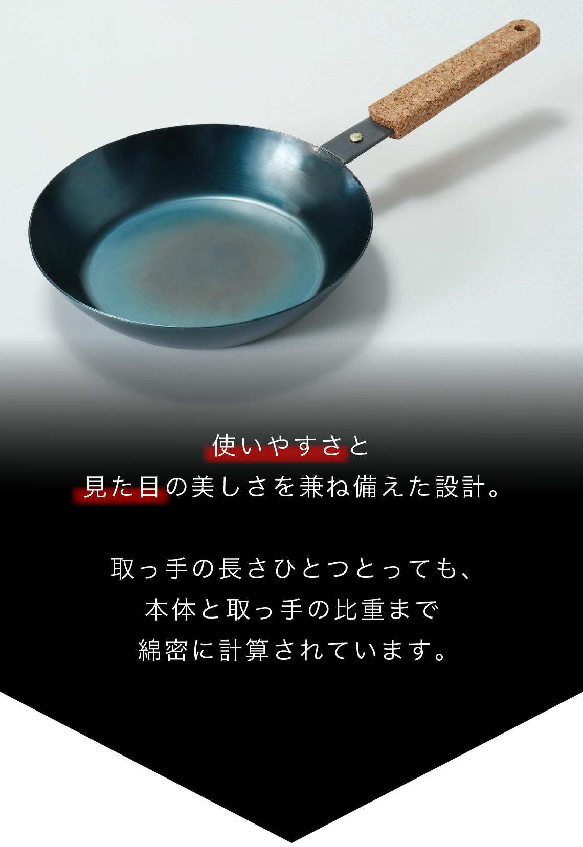 また、表面に施したハードテンパー加工により、一般的な鉄フライパンに必要なシーズニングが不要で、手入れが簡単です。そして、無塗装なので、一生モノとして長くお使いいただけます。また、鉄フライパンを使うことで自然に鉄分を補給できるという健康面でのメリットも大きな特徴となっています。