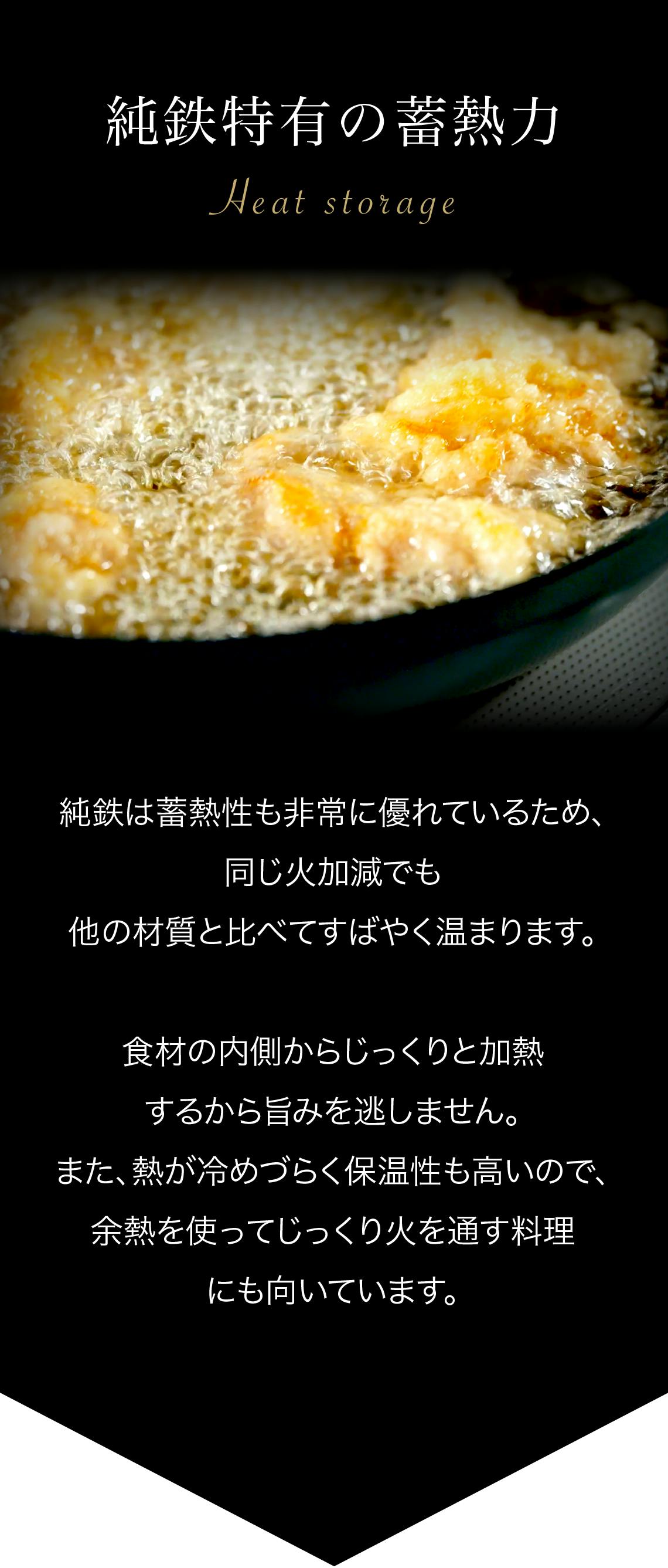 また、この迅速な熱伝導と鉄フライパン特有の蓄熱力により、食材が均一に加熱されます。