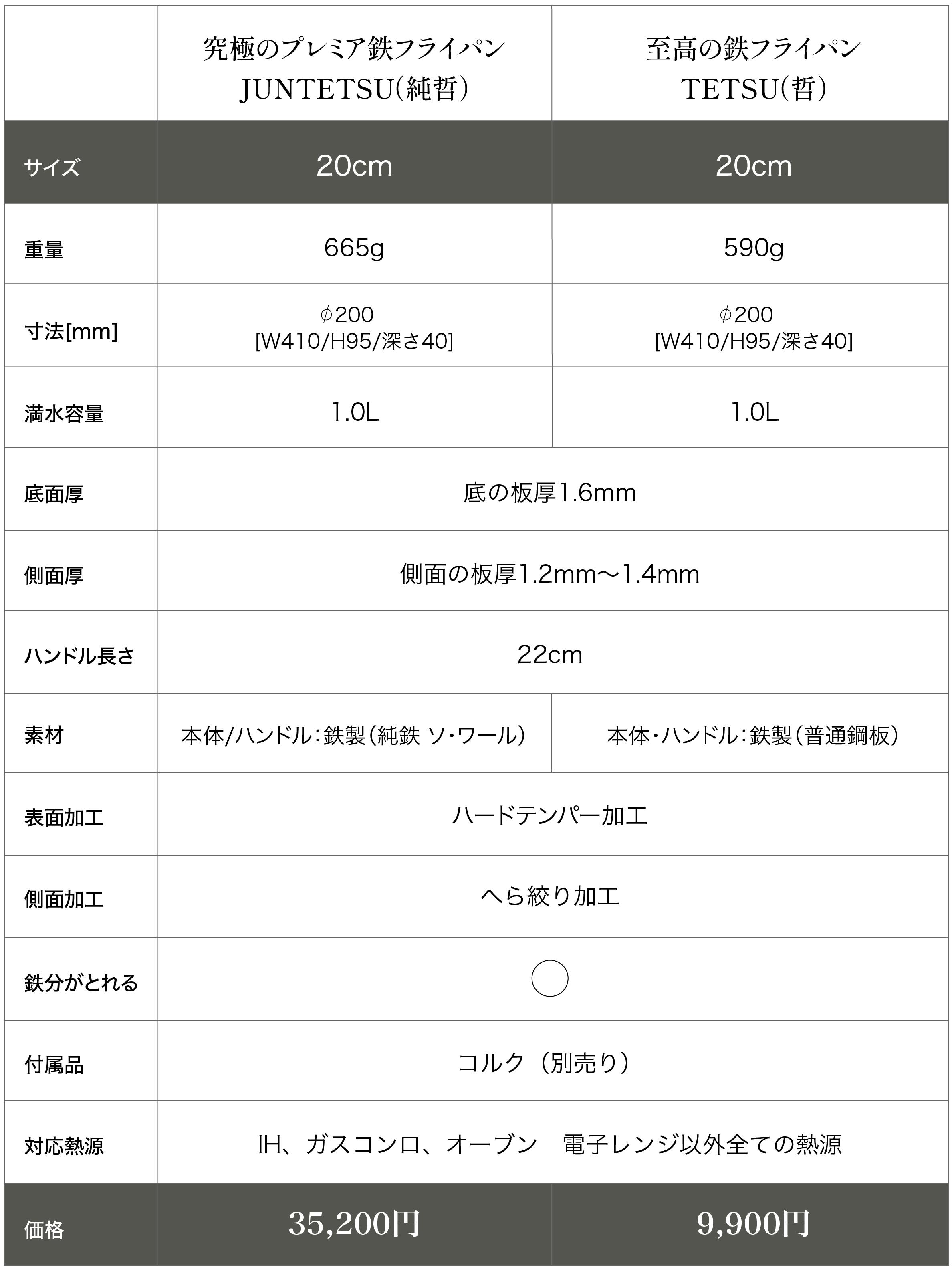 Q: 辻哲弥の至高の鉄フライパン哲(TETSU)と究極の鉄フライパン純哲(JUNTETSU)にはどのような違いがありますか?