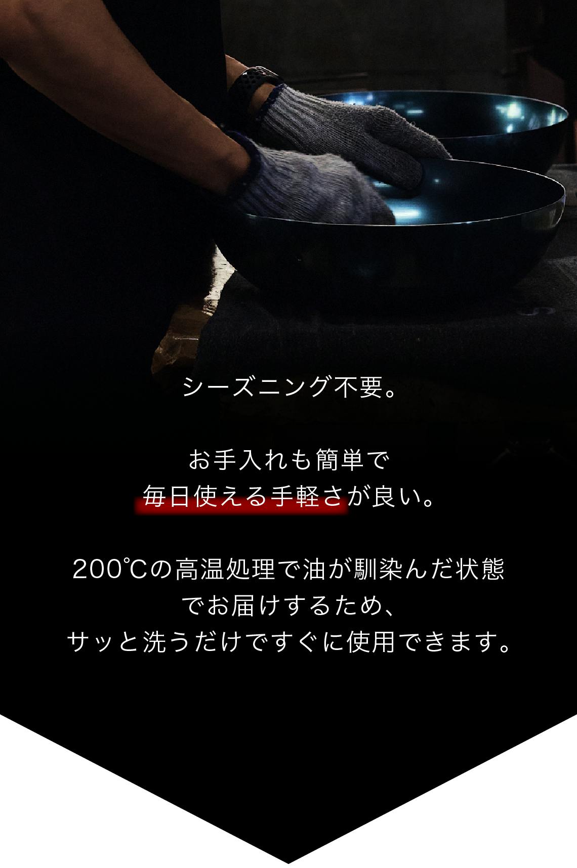 A: 哲(TETSU)と純哲(JUNTETSU)は、の表面はハードテンパー加工が施されているため、初回使用前にシーズニング(油焼き付け)を行う必要がありません。この加工により、手入れが容易で、新品時からすぐに料理に使用できます。