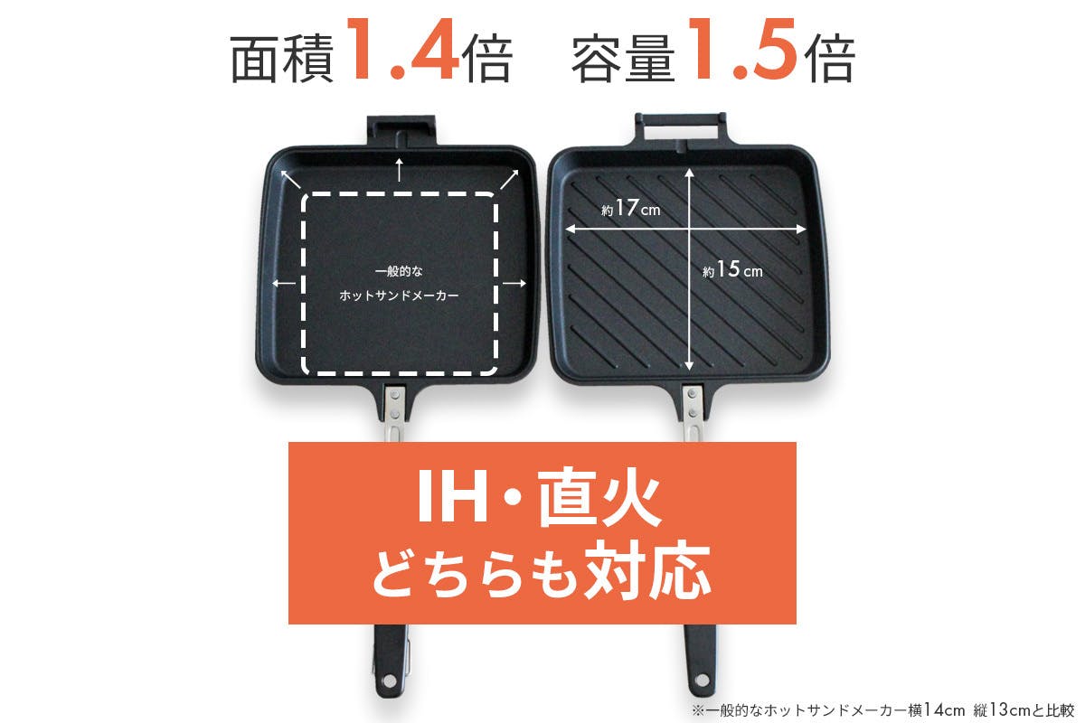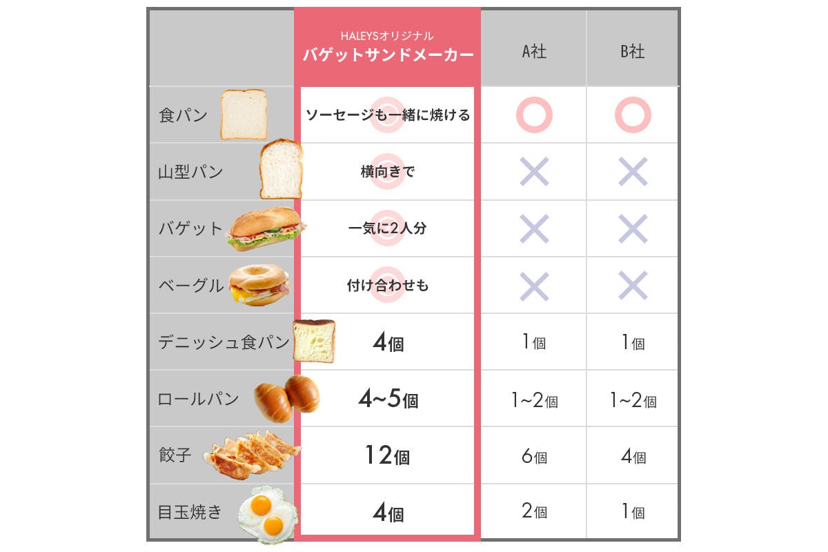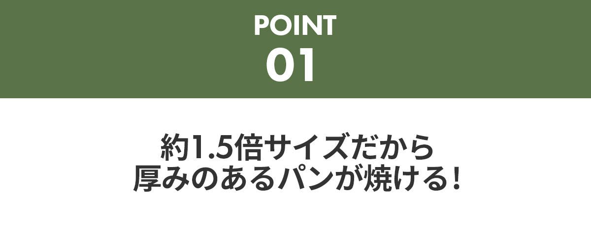 バゲットサンドメーカーは、面積が1.4倍、容量は1.5倍とワイドサイズなので、一般的なサンドメーカーでは難しかったバゲットはもちろん、厚切りパンやベーグル、カンパーニュも焼ける!