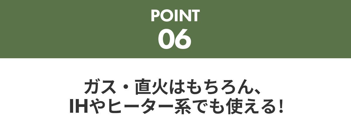 ガス火、IH、ラジエントヒーター、ハロゲンヒーター、シーズヒーターなど多様な熱源に対応できます。アウトドアはもちろん、ご自宅でもお使いいただけます。