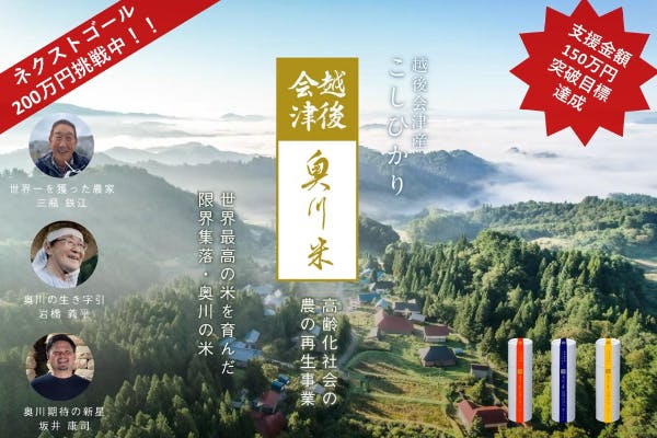 奥川には田んぼが約163ha(ヘクタール)あり、その約4分の1は遊休農地・耕作放棄地です。少子高齢化が急速に進む中で、その増加に歯止めをかけることは現状難しい状況です。ただ、日本の平均点を大きく上回る美味しさの米が獲れ、世界一の米の農家さんもいます。これまで新潟県に近い地域ということもあり、米どころとして世にはあまり認知されておらず、日の目を見てきませんでしたが、新たに「越後会津”奥川米”」としてブランドを作り、この奥川の美味しいお米を皆さんに食べてもらいたいと思っています。ぜひ、この新しいブランドと産地を創造するプロジェクトを応援していただき、社会課題にアプローチしながら、美味しいお米、素晴らしい農家さんたちとの良いご縁を結んでいただけると嬉しいです。