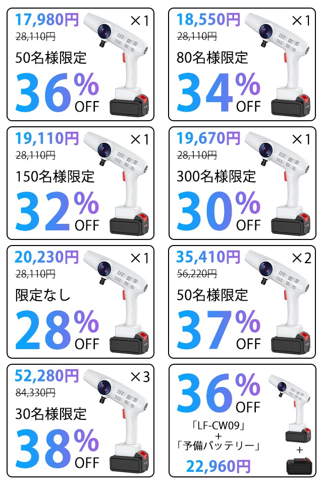 軽量・コンパクトで取り外し式の20,000mAh大容量バッテリーを内蔵しており、さらに自吸式設計のため、電源や水道が近くにない場所でも使用できます!