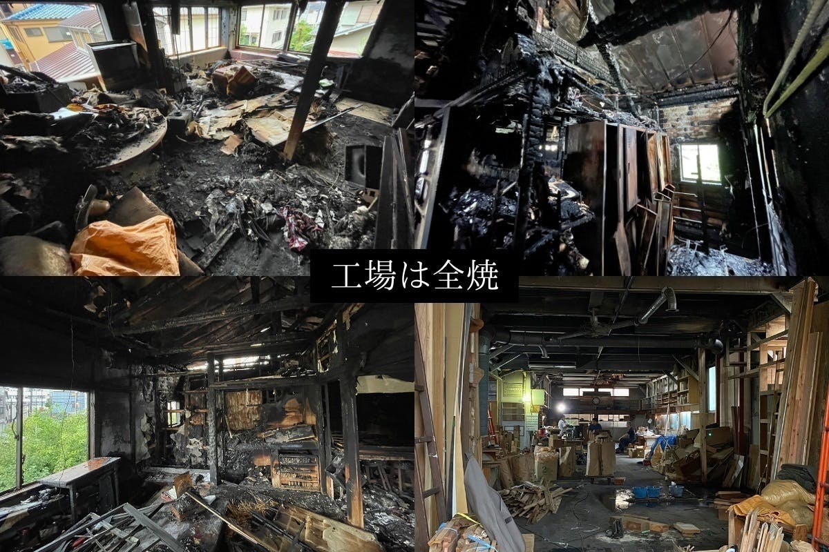 翌日、消防の方と現場検証を行い火災の原因や状況の確認を行いました。原因はコンデンサ(大きな機械を動かすため電気を溜めておく機械)の老朽化による出火で、工場は全焼。木材もほぼ全て燃え、機械類も火や消火による水で壊れ、職人の手工具や図面、作成途中の製品など何もかもが無くなりました。