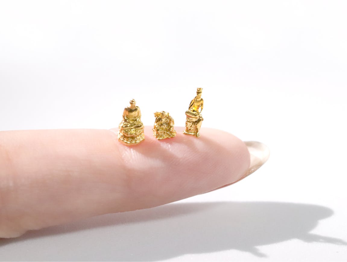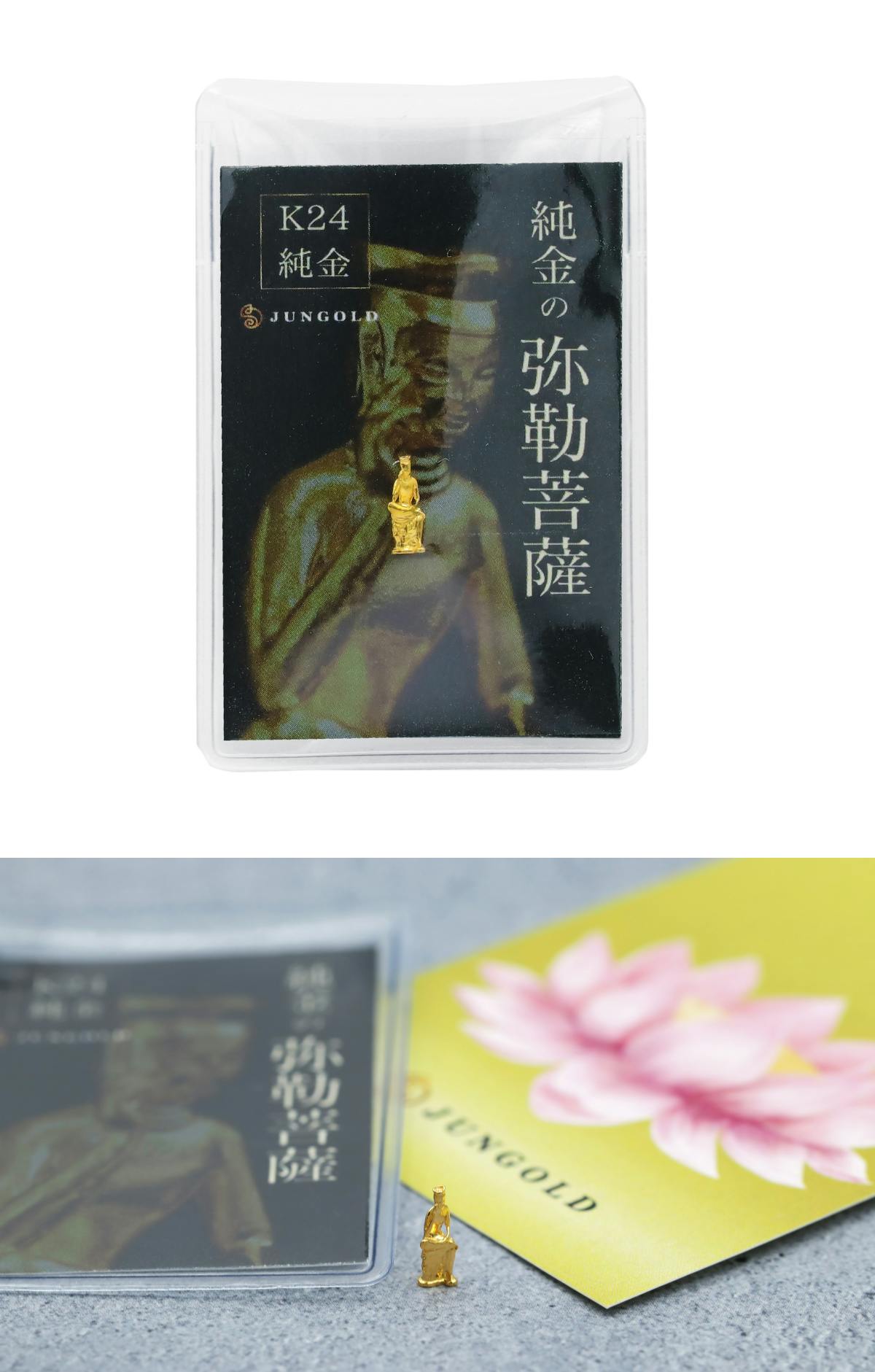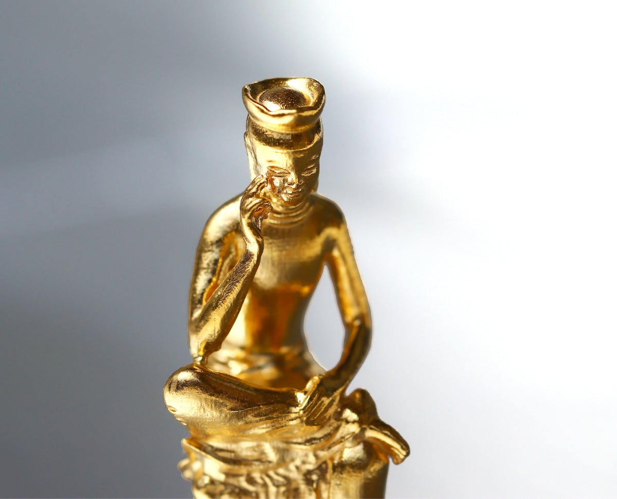 純金の弥勒菩薩像は、二つの特徴である「考える姿」と「ほほ笑み」の表現にこだわって作りました。約1gからの極小サイズながら、細部までこだわって作るのがJUNGOLD製品の魅力です。