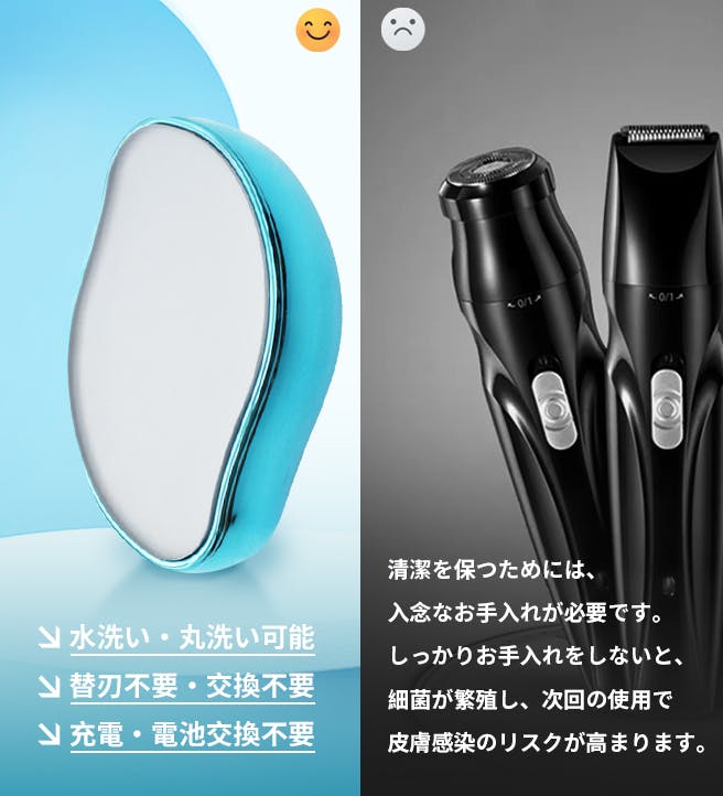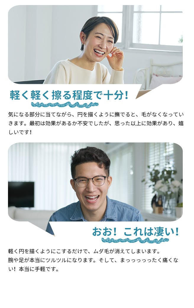 本製品は、肌への負担が少なく、痛みもないため、従来の除毛方法である刃やワックスとは異なります。手軽で簡単に使えるため、忙しい方やムダ毛処理に悩んでいる方におすすめです。