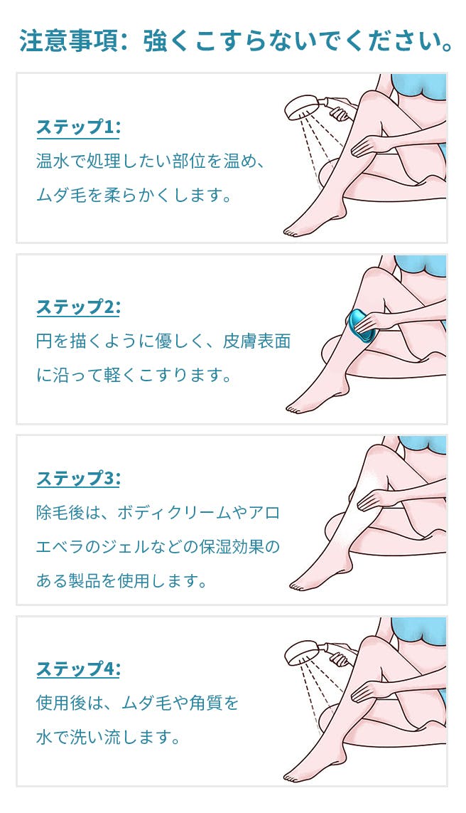 *力を入れすぎるとヒリヒリ感を引き起こす場合があるため、注意が必要です。敏感肌や摩擦に弱い方は、クリームなどを塗って皮膚を滑らかにした上で使用することをお勧めします。