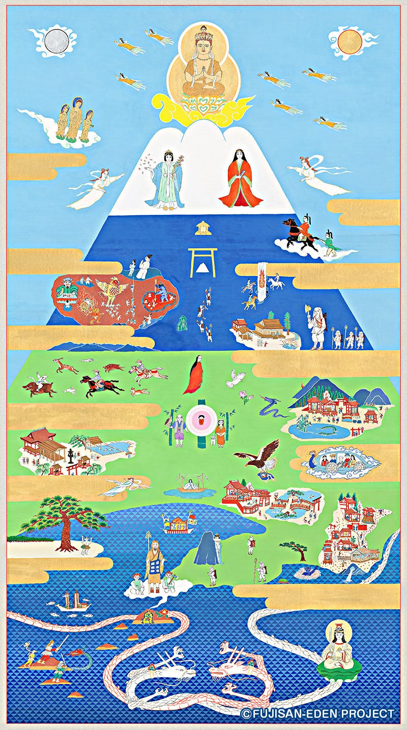 「富士山絵伝」 は、2つのユネスコ世界遺産「富士山-信仰の対象と芸術の源泉」「伊豆半島ジオパーク-南から来た火山の贈りもの」を融合した表現作品です。人の営みと地球の営みを総合的に学ぶことのできる、国際的な学習教材として活用することができます。
