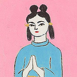 デザイナー、陶芸家、画家、の経歴を持つ中村芳楽の描く神々の絵は、一般的な仏画などのそれらとは少し異なり、デザイン的で、愛らしくポップな印象を持ちます。またその表情、ポーズが可愛らしいことに加えて衣装や背景などの色合いが鮮やかで、シンプルに描かれていることも特徴の一つです。