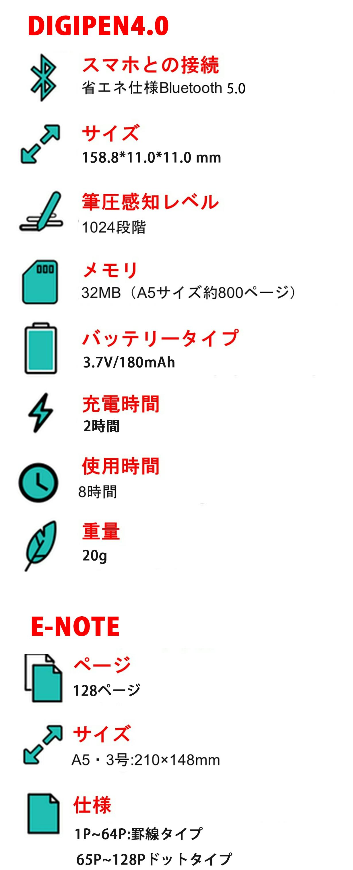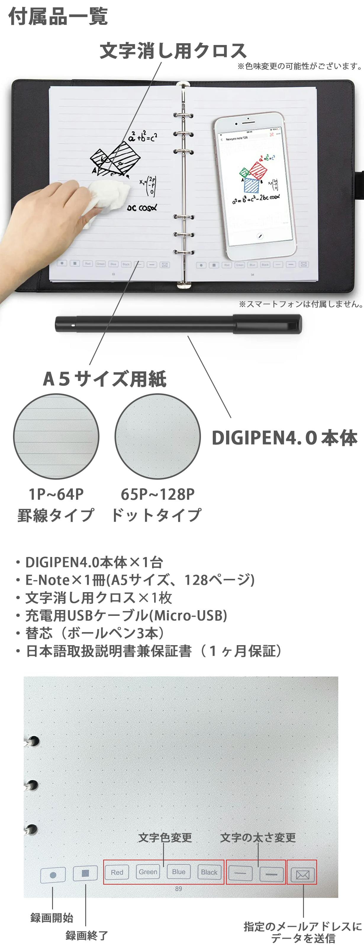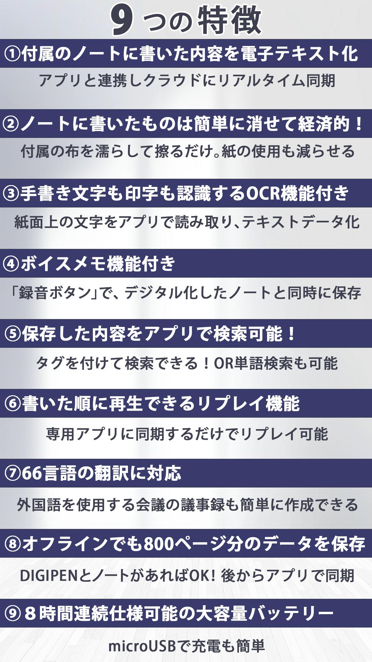 ”DIGIPEN”には手書きした内容を撮影するカメラが搭載されており、A5サイズの付属リングノートにDIGIPENで書いた内容を、専用アプリとBluetooth連携するだけで電子テキスト化出来ます!