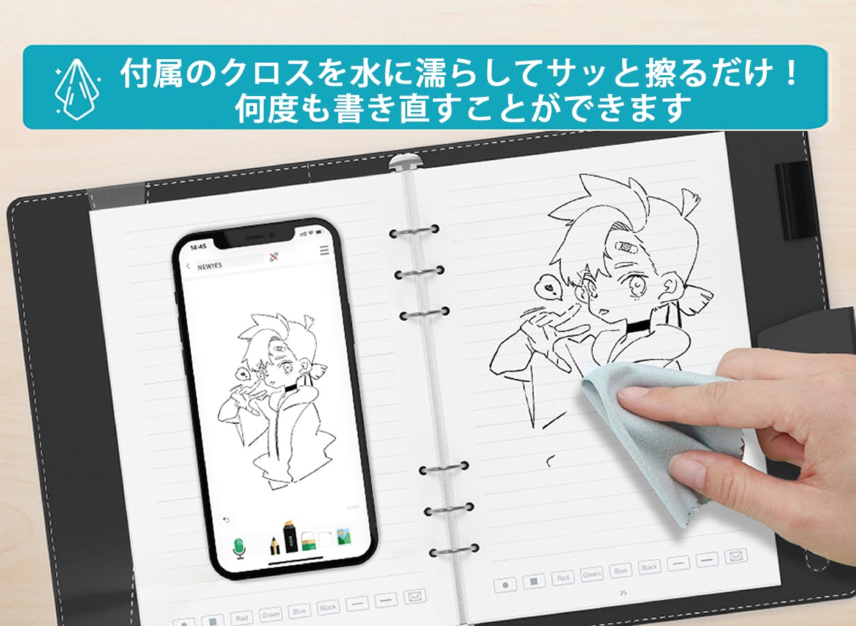 書いた文字を付属の布を濡らして擦るだけでノートに書いた文字を消すことができます。何度も書いたり消したりできるので、ノートを無駄に使うことがなく、コスパが良いです。