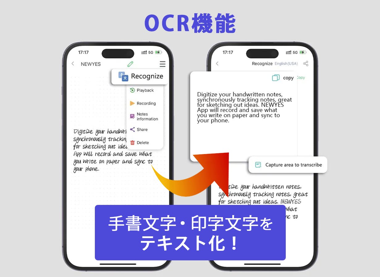 専用アプリにはOCR機能(光学式文字認識)も搭載されており、紙面上の文字(印字、手書き問わない)をアプリで読み取り、電子テキスト化可能です。
