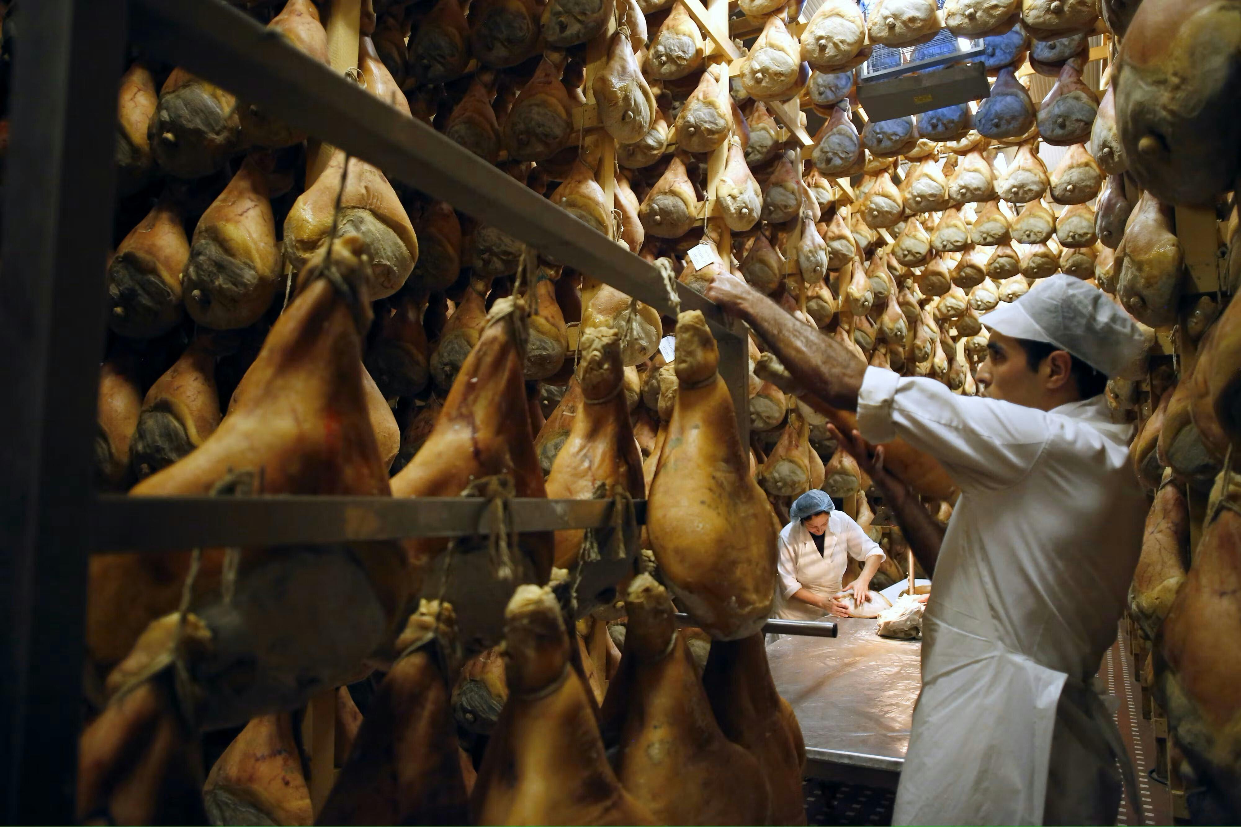 農場から直接買い付けした生ハムを検品し