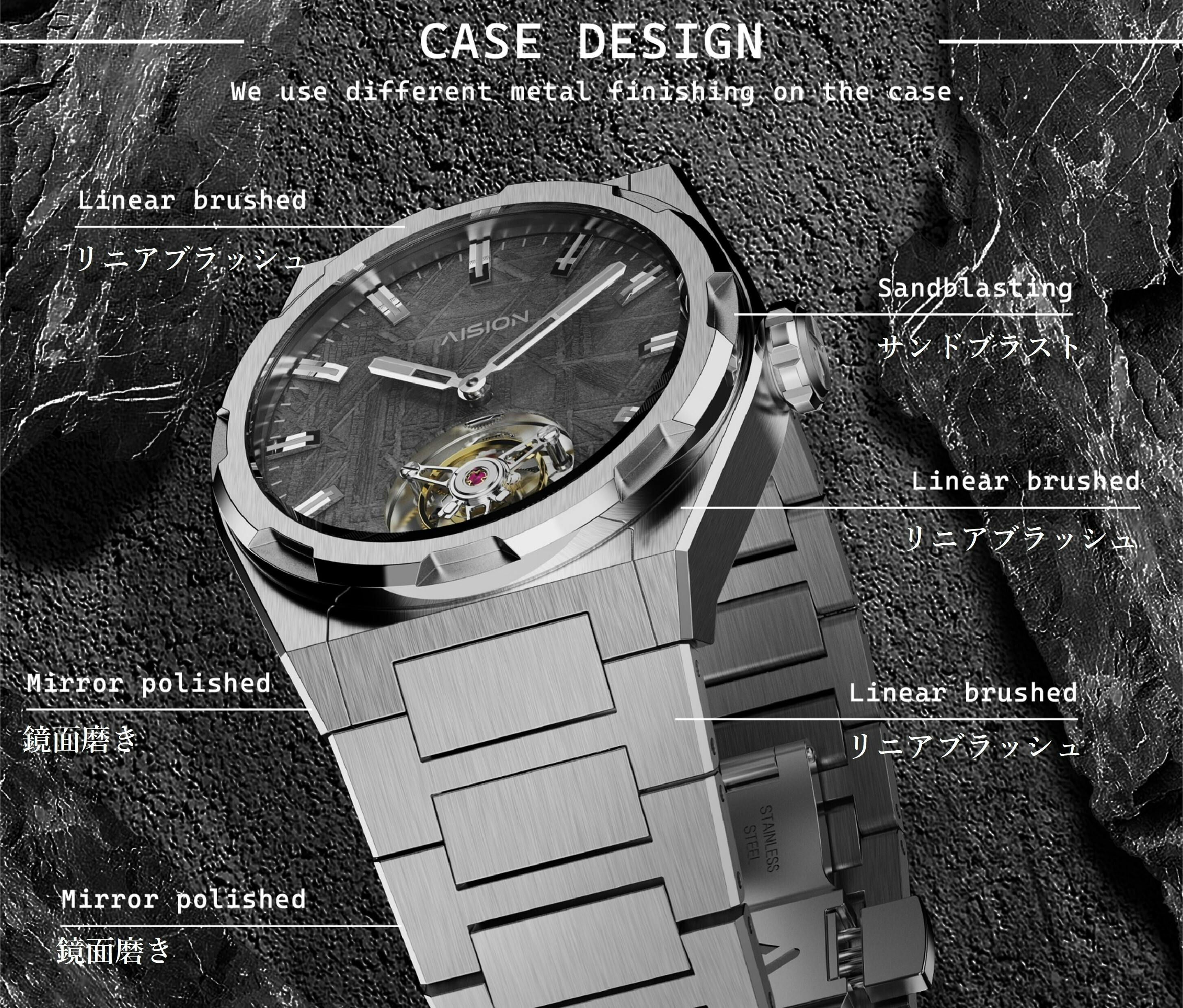直線的な模様のリニアブラッシュ、強く光を反射する鏡面仕上げ、マットな質感のサンドブラスト。