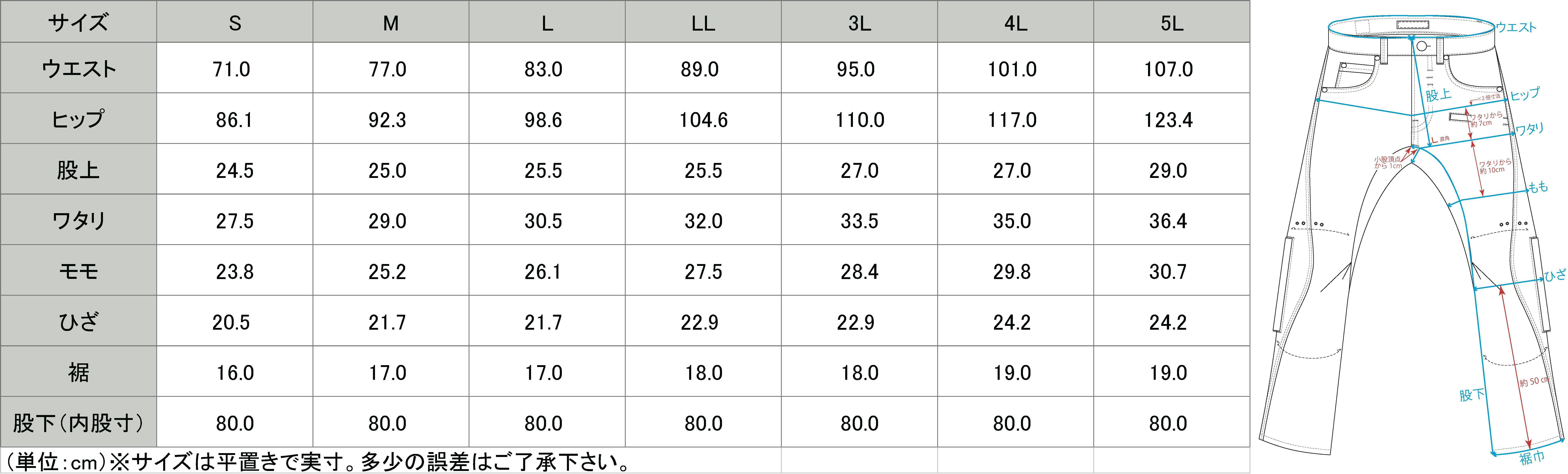 -ウエストサイズ:S(28inch/71cm)、M(30inch/77cm)、L(32inch/83cm)、LL(XL)(34inch/89cm)、3L(36inch/95cm)、4L(38inch/101cm)、5L(40inch/107cm)・・・下記寸法表参照