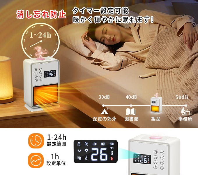 最大24時間(1時間単位で設定可能)の切タイマー機能付きなので、好きな時間に電源を切ることができます。タイマーを設定しない場合でも、24時間後自動で運転を停止します。切り忘れを防ぎ、無駄なく省エネ!