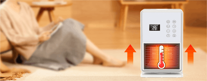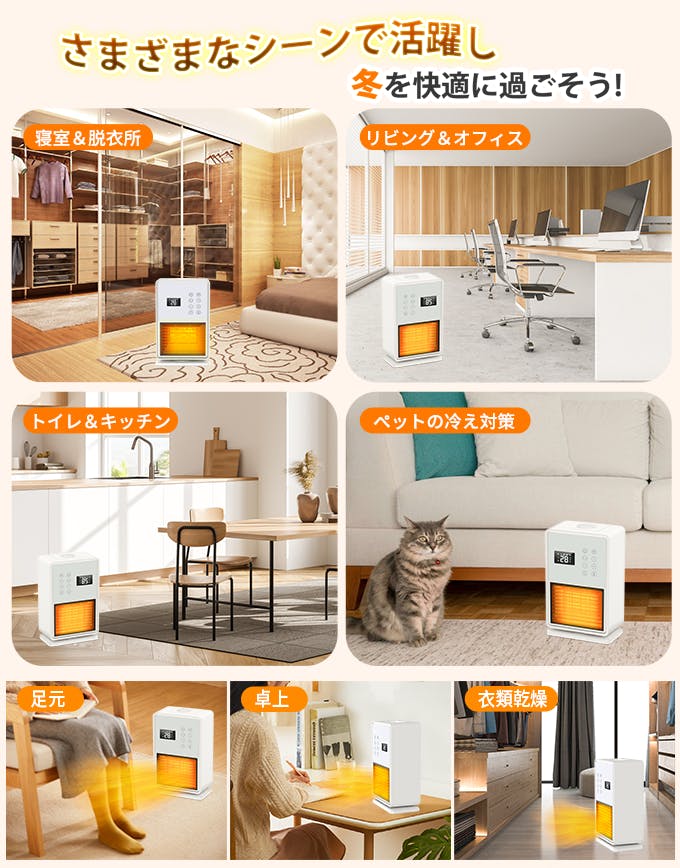 脱衣所や寝室など狭い空間の温度を上げるのに適しています。また、仕事中や自宅で過ごす際の手足の保温にも。