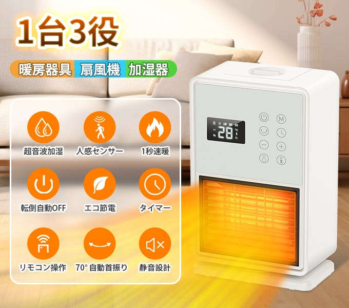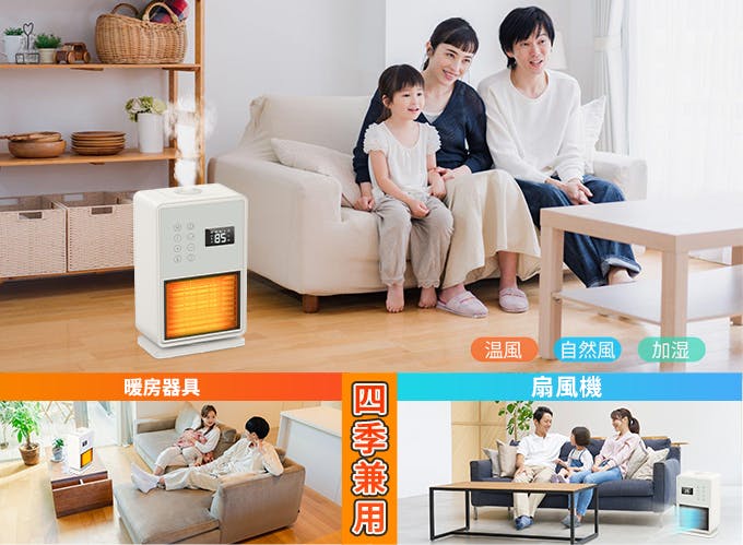 ①暖房・扇風機・加湿器が一体になり、一年中使用可能。
