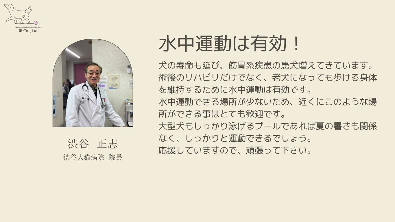 愛犬が歩けなくなったことがきっかけで犬の身体について学び、それらの知識を活かしながら犬が無理せず水中で運動できる場所を作りたいと思い、プール建設を立案するに至りました。
