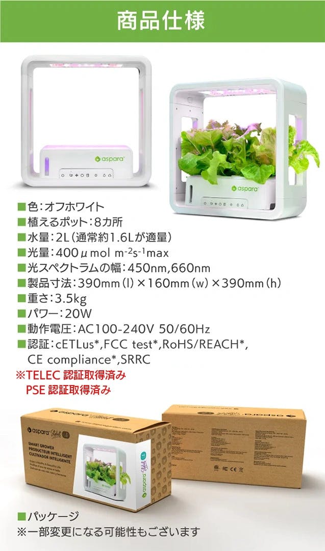 海外仕様のアスパラガーデンを「並行輸入」または海外サイトから直接購入された場合、「技術基準適合証明(TELEC認証)」や「電気用品安全法(PSEマーク)」が取得されておりません。日本国内においては「使用者」が違法となりますのでご注意ください。