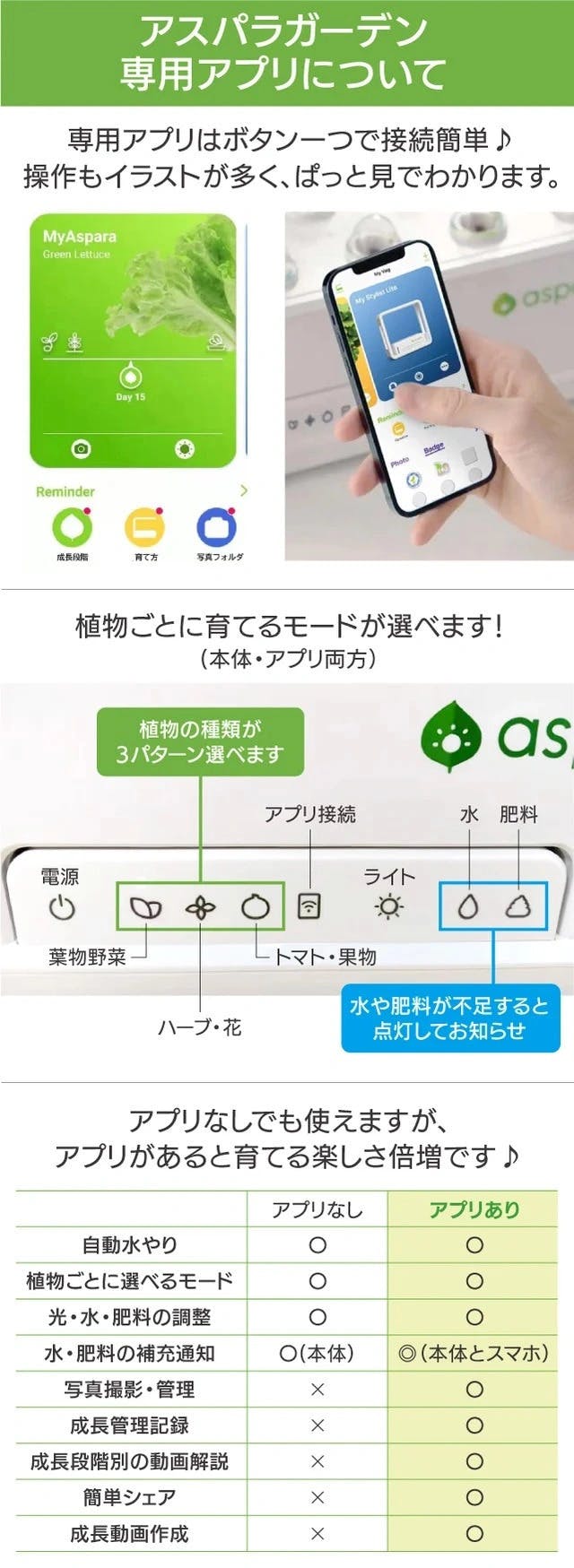 A:はい。アプリがなくても全自動での水やり、栄養管理はできます。(植物の種類ごとに選ぶことも可能です)ただ、専用アプリには成長に応じた動画によるアドバイス、成長記録の管理、シェアなど便利な機能がたくさんございます。ぜひご活用頂ければより楽しいガーデニングが楽しめると思います!