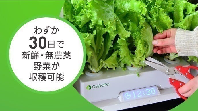 独自開発のLED成長ライト、自動散水システムと高度なセンサーの組み合わせで、葉物野菜なら約30日で収穫できます。採れたてフレッシュな無農薬野菜が食卓を彩ります。※育てる環境によって収穫時期は多少前後します。
