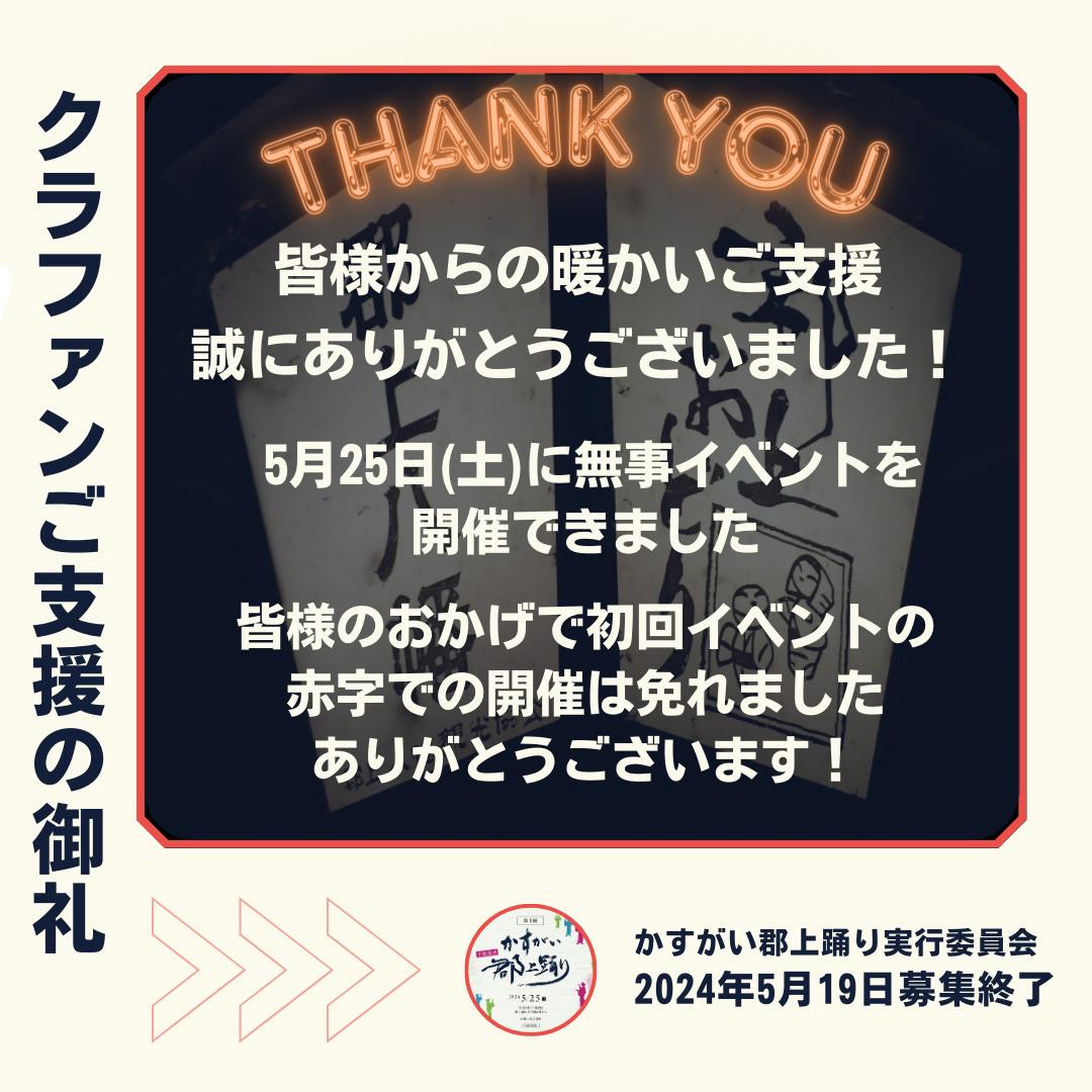 2024年4月18日に開始したクラウドファンディング「春日井市を盛り上げる!初開催の郡上おどりプロジェクト」は、2024年5月19日をもって募集終了いたしました。