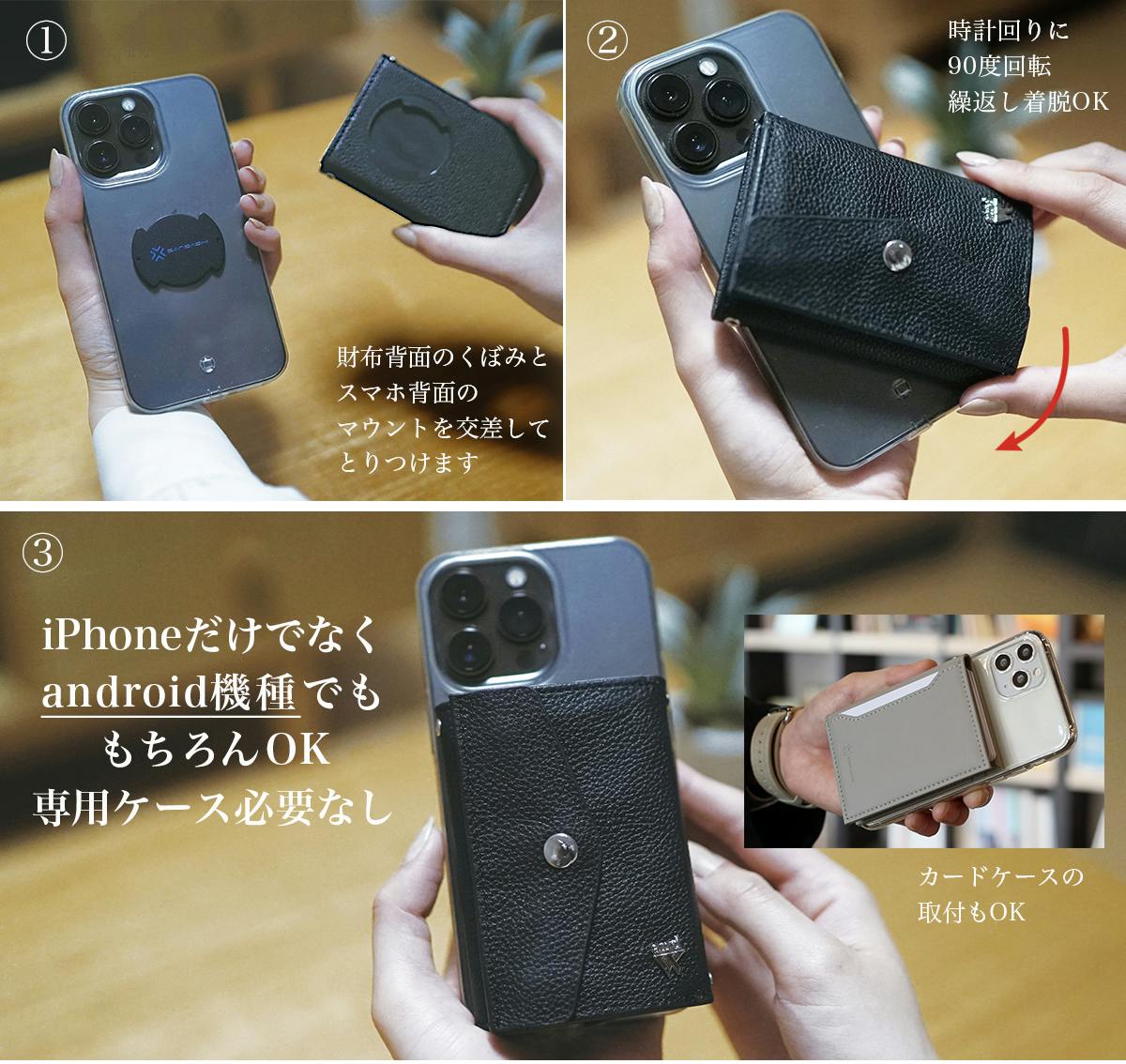 「マウント」をスマホ背面に取付けることでスマホショルダー財布をジョイントできるようになります。そのためiPhoneやandroid等、機種に関係なく使える。専用のケースは必要ありません。