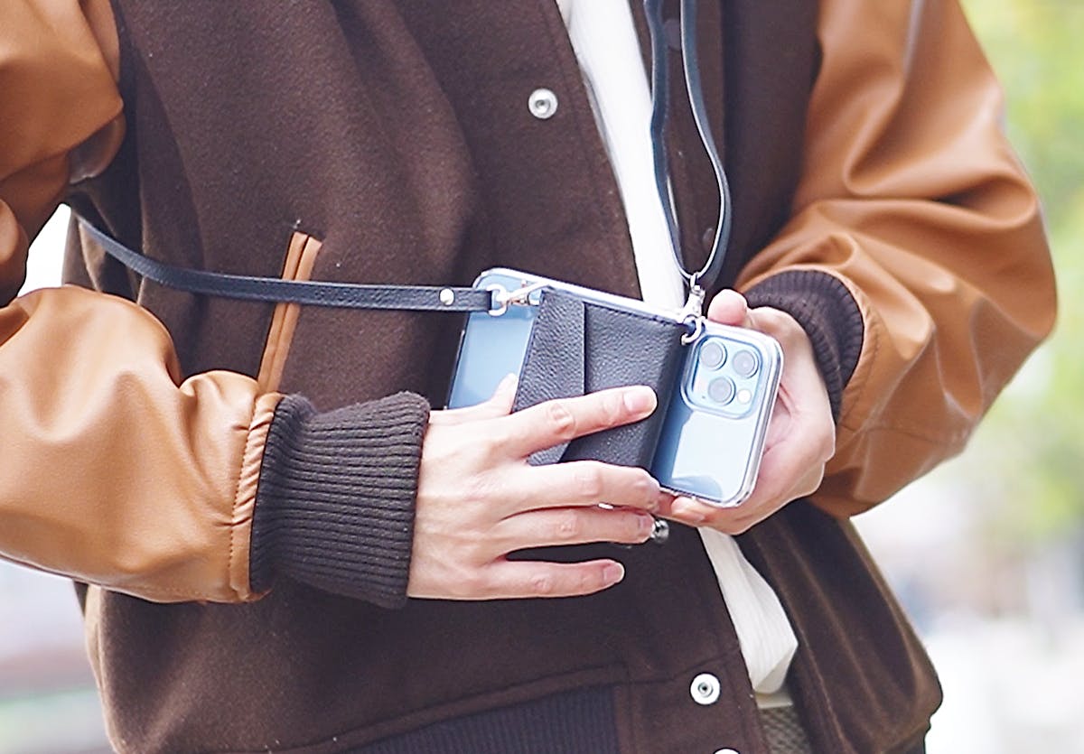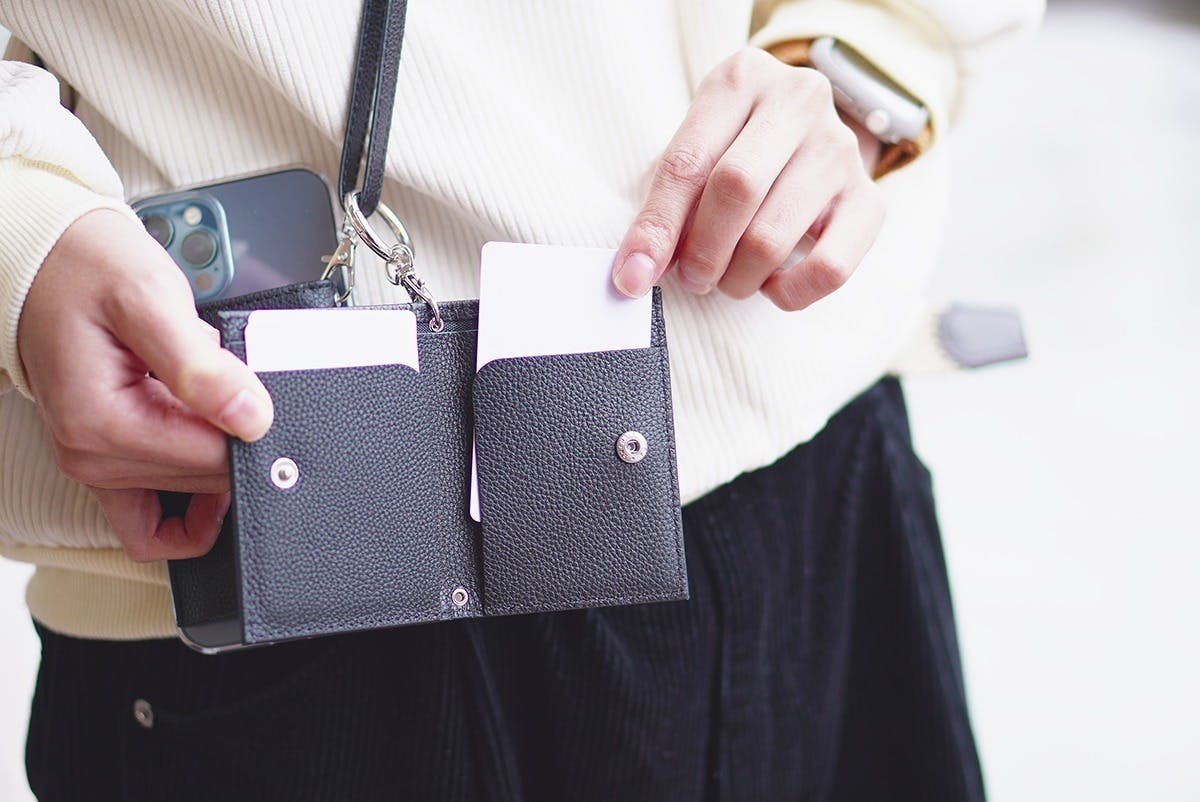 スマホショルダー財布として使えて、これだけで手ぶらで外出ができる。