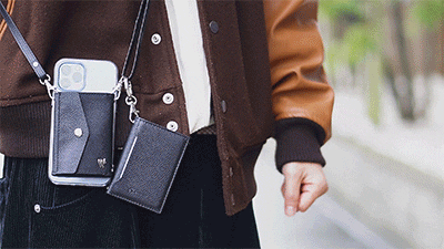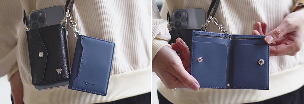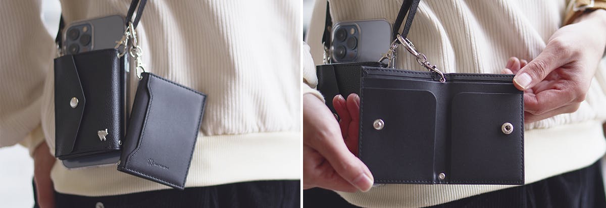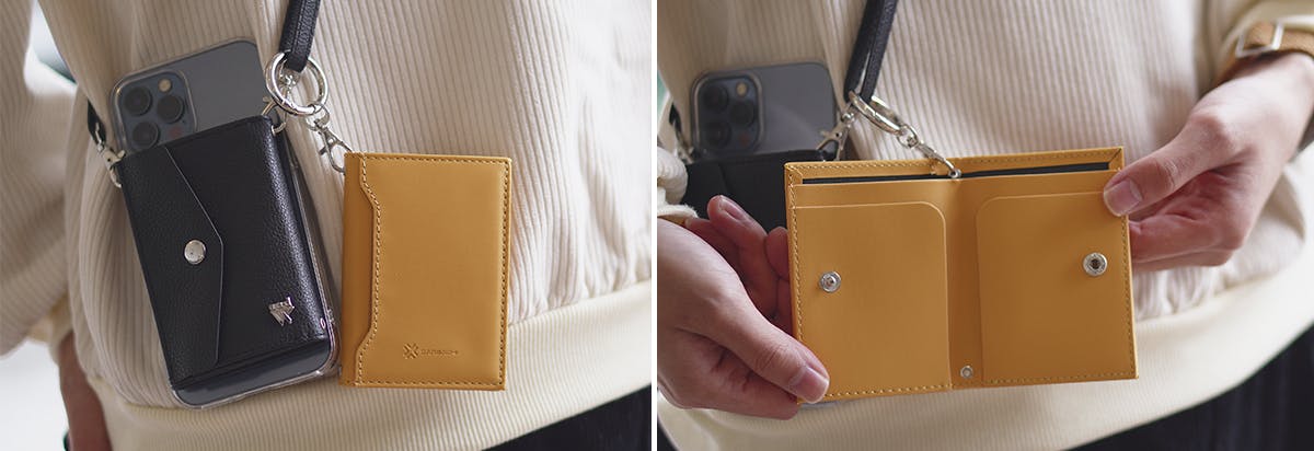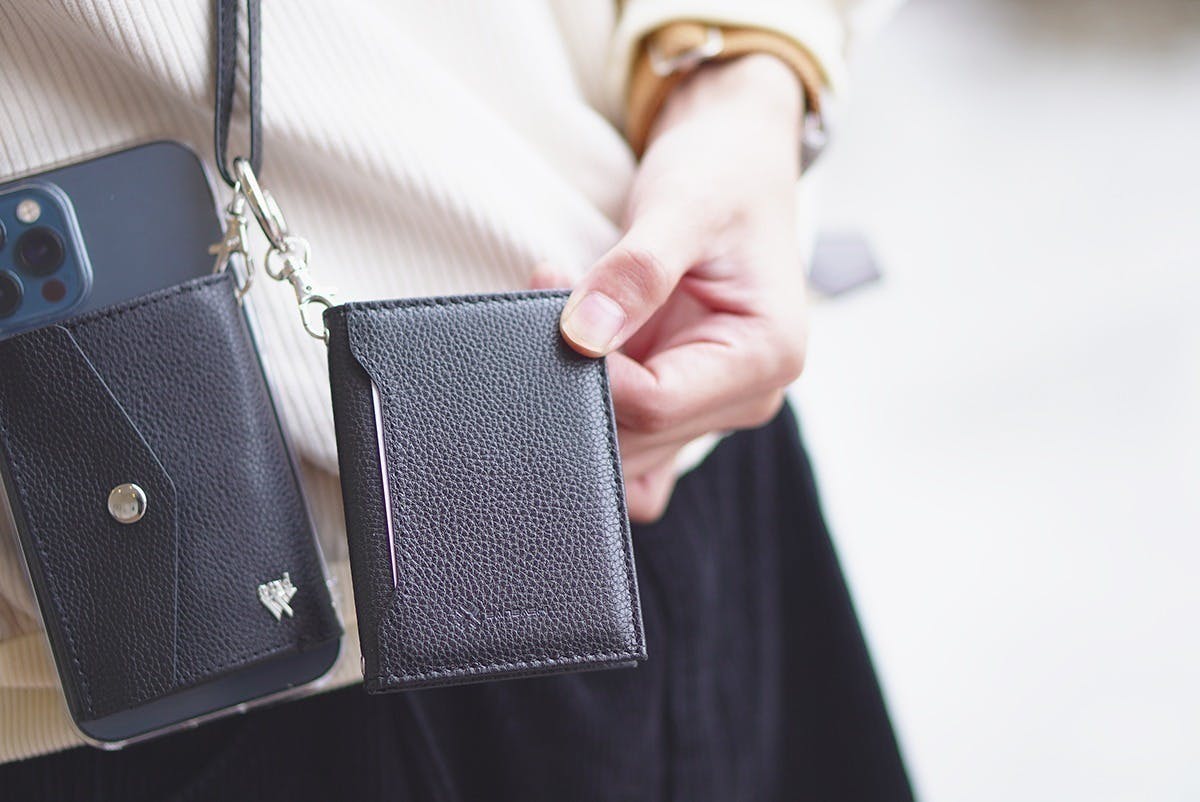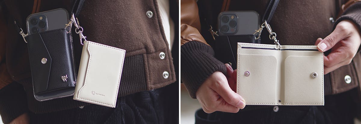 スマホと財布「and W」をドッキングすることで、スマホショルダー財布として使える。スマホと財布の着脱は自由自在。財布「and W」には、カード4枚・紙幣8枚・コイン15枚・鍵1つ収納できる。