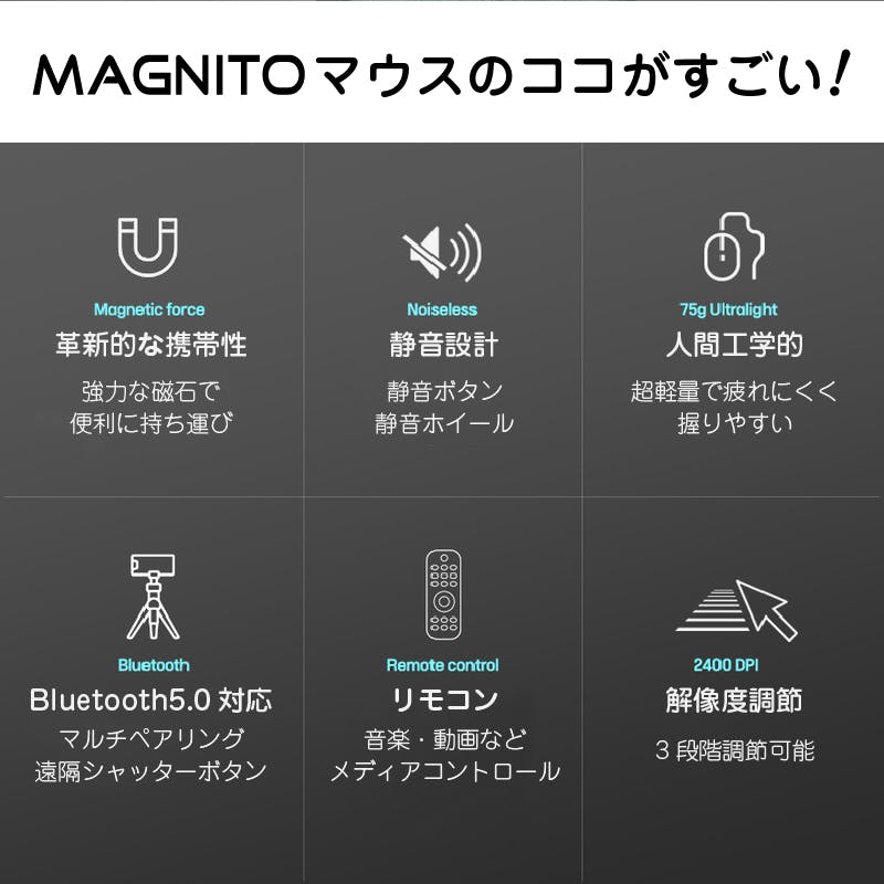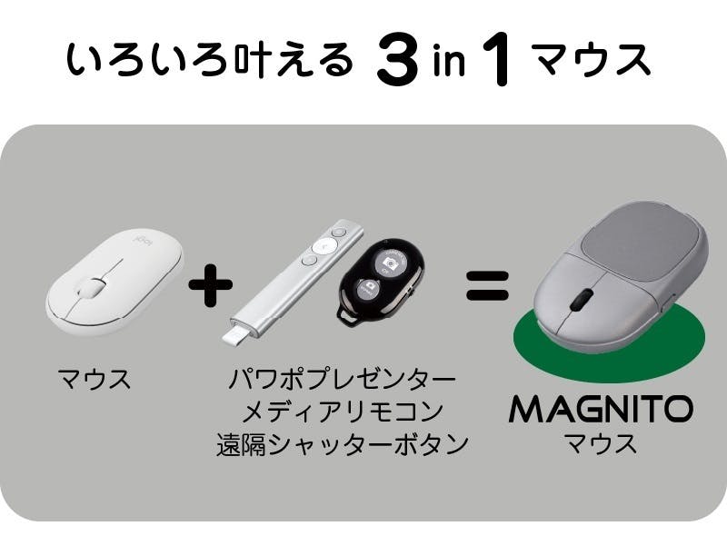 タブレットやパソコン、マウス、スマートフォン撮影、メディア再生、プレゼンテーションのスライドショーコントロールなどすべての機能がMagnitoマウスひとつで叶います!