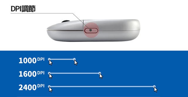 マウス側面のDPIボタンで作業環境に応じて、迅速かつ便利に解像度を800/1200/2400と3段階に調節できます。