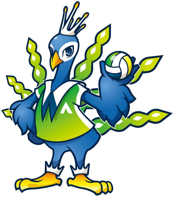 「P」にアスパラガスモチーフを組み込みました。また、その先端に「ダイヤ」「ひし形」を6つ配置することで6人制バレーボールをイメージしております。形としては価値が高く、結婚指輪などにも使われるダイヤには、「新たな価値」を提供し、自治体・民間企業・住民との「絆」を結ぶ存在を目指すという想いが込められています。また、ひし形は、古来より成長繁茂の象徴とされており、植物が生い茂るように選手が成長するという想いも込められています。