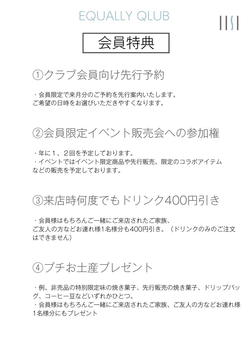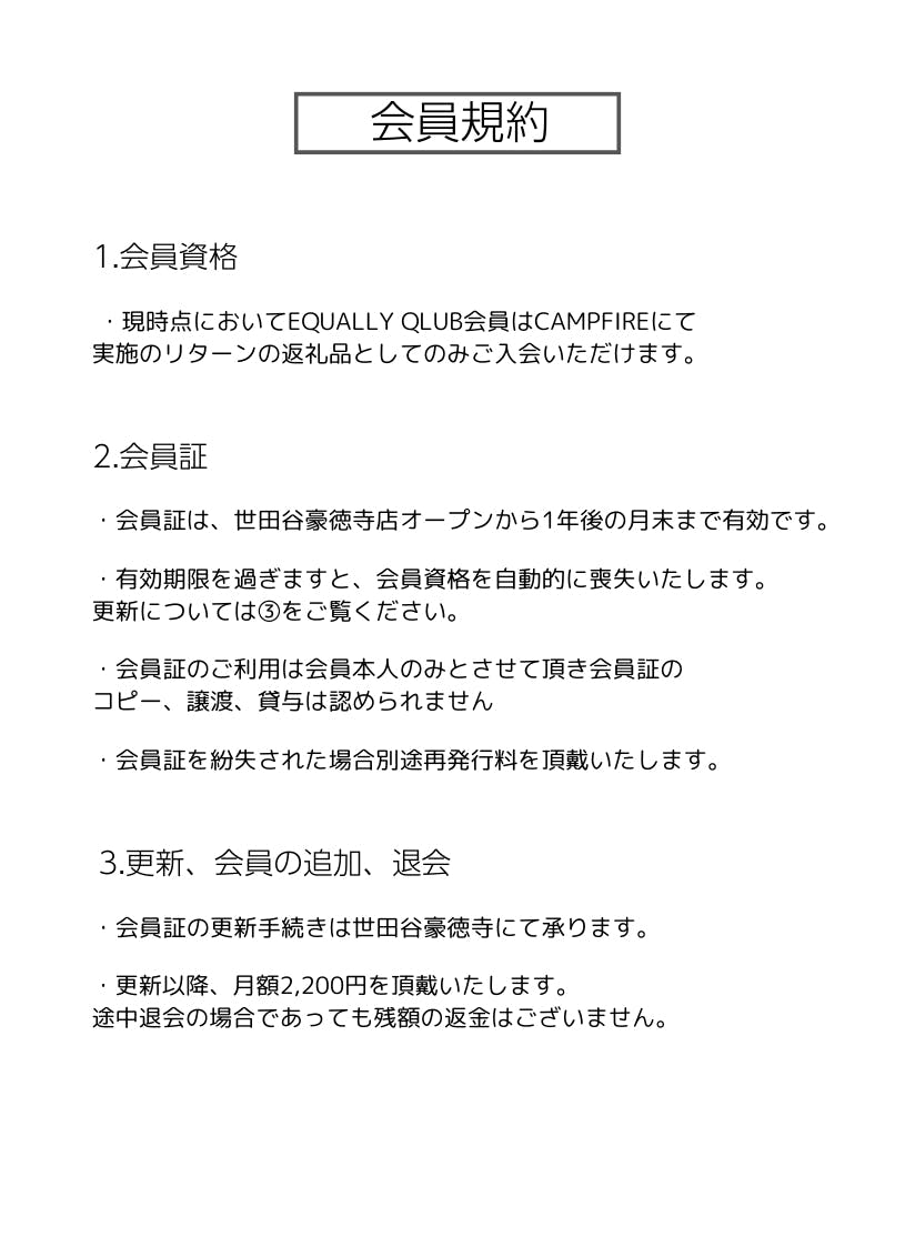 EQUALLYは間借りのお店から始まりようやく実店舗をオープンするに至りました。これも当店へお越しくださるお客様のご愛顧があってこそでございます。本当にありがとうございます。またご愛顧くださるお客様へよりEQUALLYの持つ価値を体験しお楽しみいただきたい。EQUALLYが好きだと言ってくださる方の輪を広めたい。一緒にEQUALLYを創っていきたいとの思いから豪徳寺店舗オープンにあわせ「EQUALLY CLUB」という会員コミュニティを作るに至りました。
